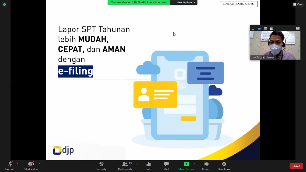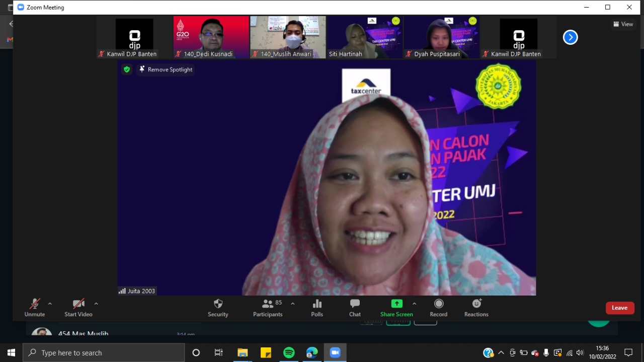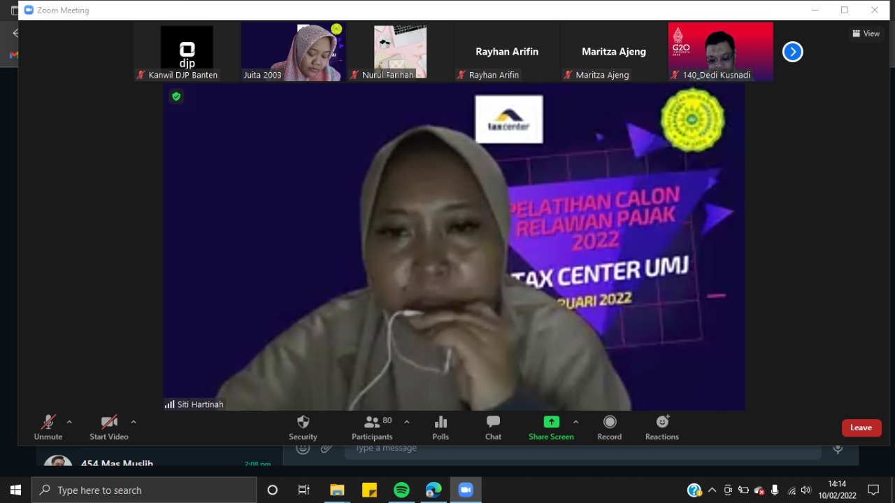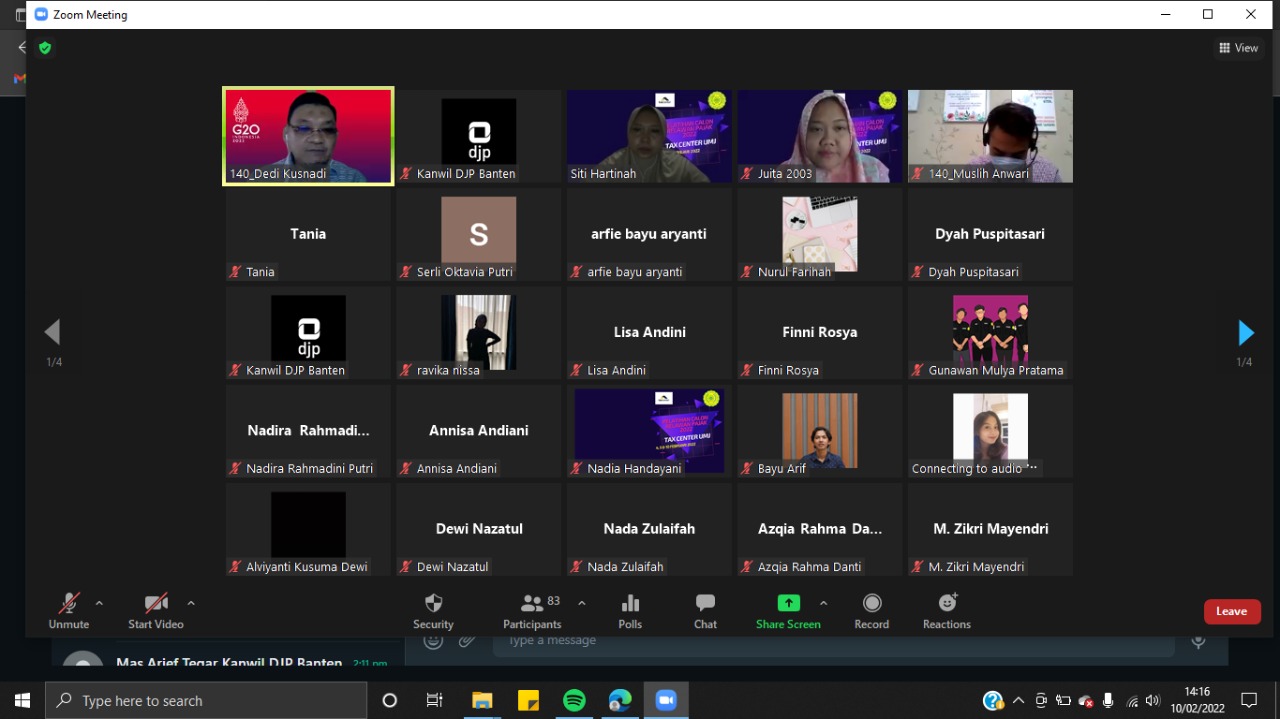 Kantor Wilayah DJP Banten bersama Tax Center Universitas Muhammadiyah Jakarta (UMJ) melakukan kegiatan pembekalan kepada relawan pajak secara daring melalui aplikasi zoom cloud meeting di Kota Serang, Banten (Kamis, 10/03).
