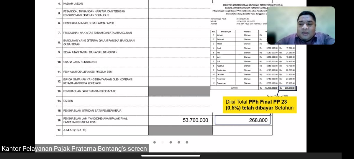 Lebih lanjut lagi Rama memaparkan dokumen-dokumen yang perlu disiapkan sebelum melakukan pelaporan SPT Tahunan diantaranya daftar rekapitulasi omzet selama 1 (satu) tahun, daftar harta, daftar pinjaman/hutang, Kartu Keluarga (KK), bukti pemotongan pajak apabila terdapat pemotongan pajak selama tahun pajak yang akan dilaporkan. Selanjutnya, kegiatan diakhiri dengan sesi tanya jawab.
