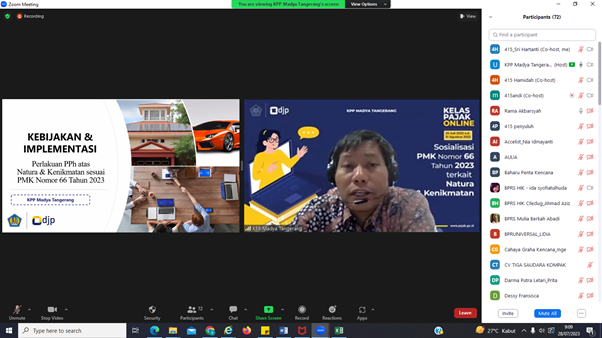 Kantor Pelayanan Pajak (KPP) Madya Tangerang menyelenggarakan sosialisasi mengenai Peraturan Menteri Keuangan (PMK) Nomor 66 Tahun 2023 yang membahas tentang Natura secara daring melalui Zoom Meeting langsung dari ruang studio KPP Madya Tangerang, Gedung Menara Top Food, Alam Sutera, Jalan Jalur Sutera Barat No.3, RT.003/RW.006, Panunggangan Timur, Pinang, Kota Tangerang, Banten (Jumat, 28/7).