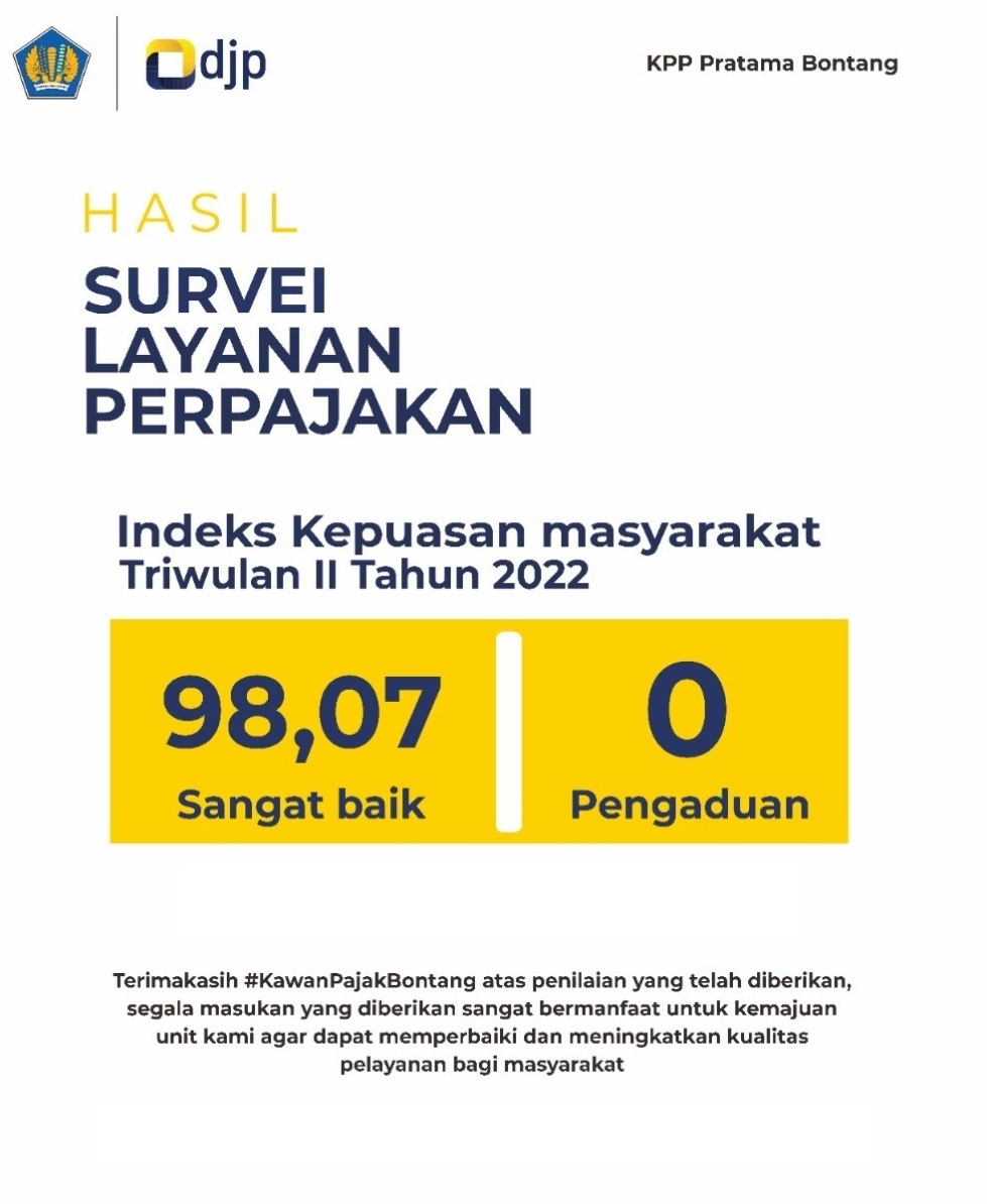 Sebelumnya, telah diadakan survei kepuasan layanan untuk jangka waktu 1 April 2022 dan berakhir 30 Juni 2022. Pada periode triwulan II tersebut, indeks kepuasan masyarakat atas layanan KPP Pratama Bontang mencapai angka 98.07 yang artinya adalah wajib pajak merasa sangat puas dengan pelayanan KPP Pratama Bontang. Angka ini juga meningkat 2.67 poin dari periode sebelumnya.