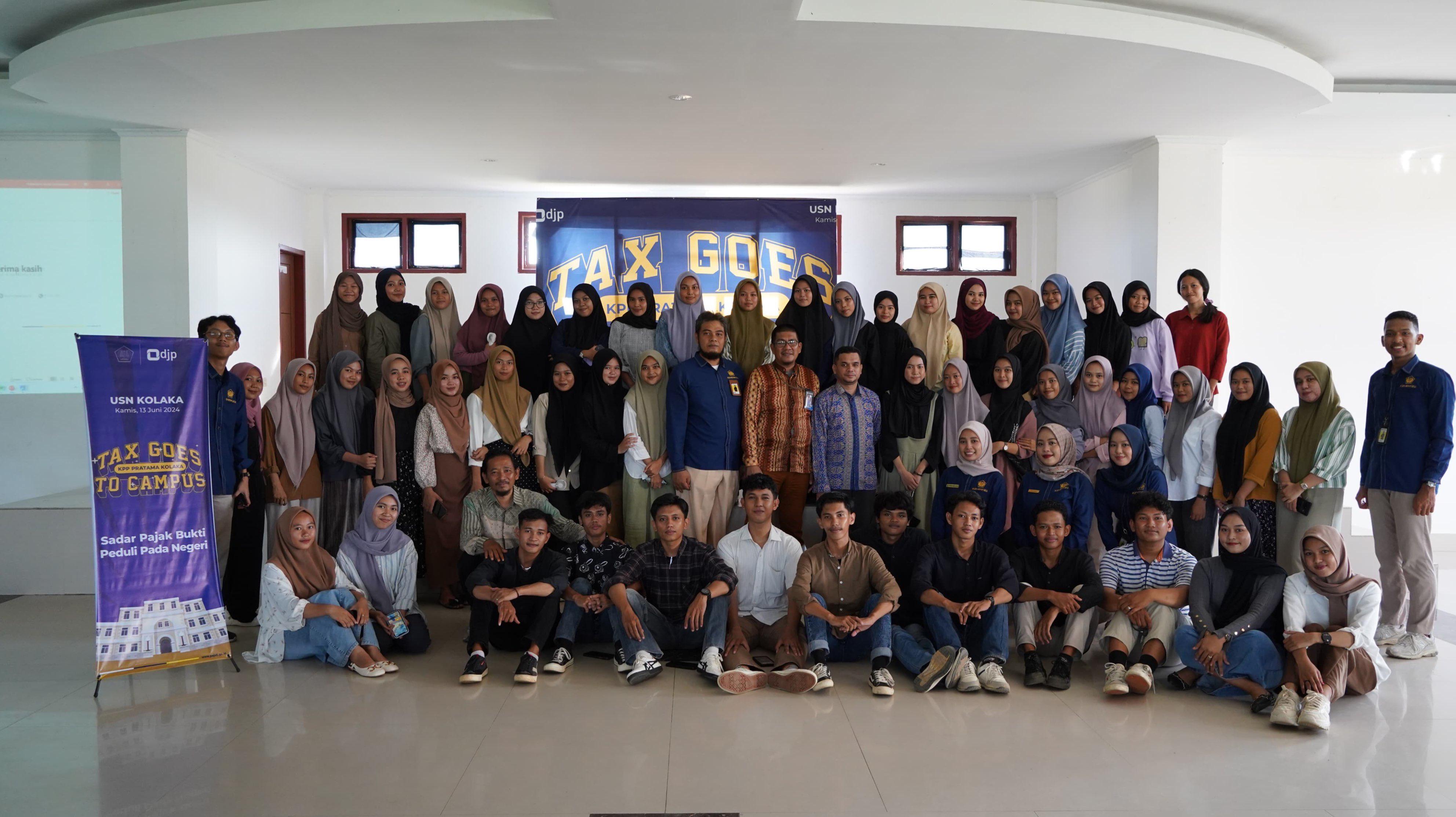 Kantor Pelayanan Pajak (KPP) Pratama Kolaka melaksanakan kegiatan Tax Goes To Campus (TGTC) dengan melibatkan mahasiswa Fakultas Ilmu Sosial dan Ilmu Ekonomi (FISIE) Universitas Sembilanbelas November (USN) Kolaka (Kamis, 13/6). Kegiatan berlangsung di Aula Lantai 3 Gedung Fakultas Sainstek USN Kolaka yang berada di Kecamatan Tanggetada, Kabupaten Kolaka.