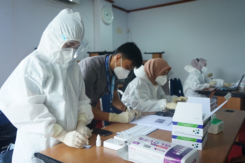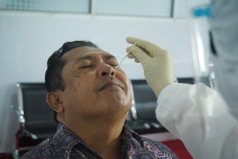 Pelaksanaan tes cepat antigen oleh Laboratorium Kimia Farma Kendari untuk pencegahan peyebaran Covid-19 di lingkungan KPP Pratama Kendari.