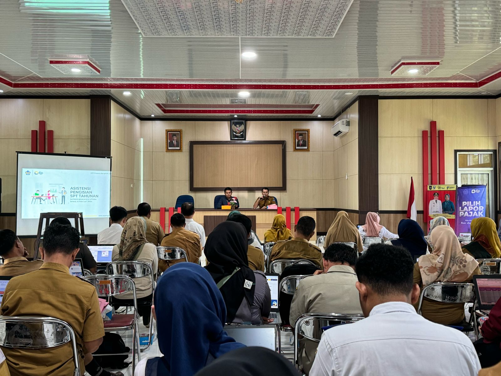 Kantor Pelayanan Pajak (KPP) Pratama Bengkulu Satu menyelenggarakan kegiatan asistensi pengisian Surat Pemberitahuan (SPT) Tahunan Orang Pribadi Tahun Pajak 2023 di Aula Dinas Kesehatan Kabupaten Bengkulu Utara, Jalan Prof. M. Yamin, Kecamatan Argamakmur, Kabupaten Bengkulu Utara (Selasa, 6/2). Kegiatan ini diikuti oleh para pegawai dari Dinas Kesehatan (Dinkes) Kabupaten Bengkulu Utara dan Badan Keuangan dan Aset Daerah (BKAD) Kabupaten Bengkulu Utara.