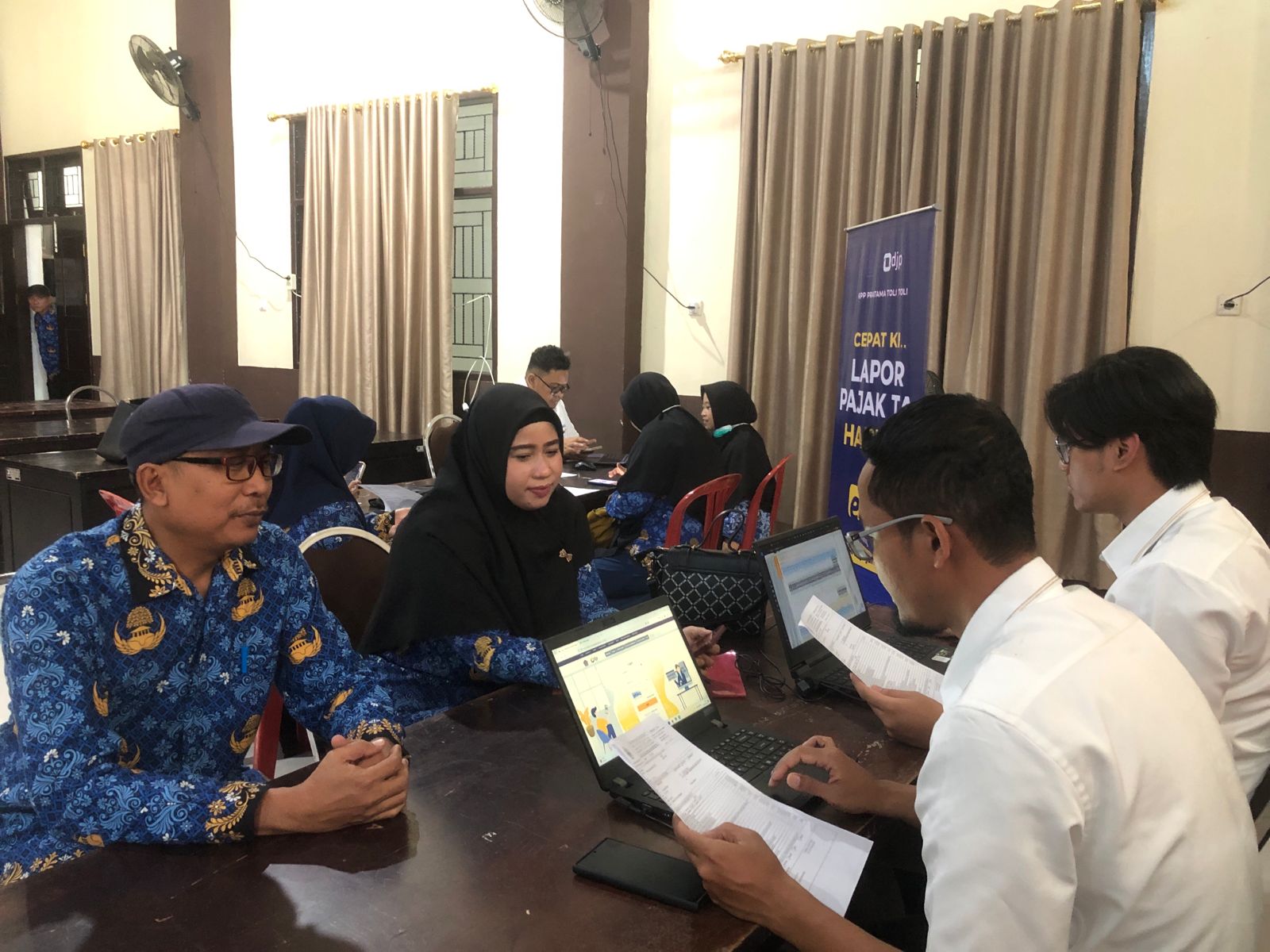 Kantor Pelayanan Pajak Pratama Tolitoli berkoordinasi dengan Dinas Kesehatan Kabupaten Tolitoli dalam kegiatan Pojok Pajak (Senin, 19/2). Layanan yang diberikan yaitu asistensi pelaporan Surat Pemberitahuan (SPT) Tahunan Orang Pribadi Tahun Pajak 2023. Pojok Pajak ini didirikan di Aula Dinas Kesehatan Kabupaten Tolitoli, Sulawesi Tengah.