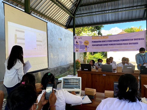Asisten penyuluh (Aspen) pajak Kantor Pelayanan Pajak (KPP) Pratama Singaraja, Made Saras Mulia Rani memberikan asistensi terkait pembuatan bukti pemotongan/pemungutan unifikasi penyampaian Surat Pemberitahuan (SPT) masa unifikasi kepada seluruh Bendahara Desa di Kecamatan Busungbiu, Buleleng, Bali (Rabu, 28/7).