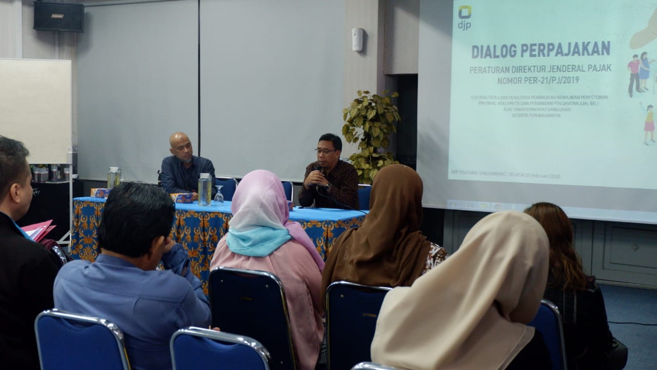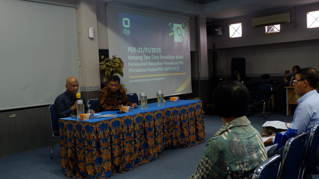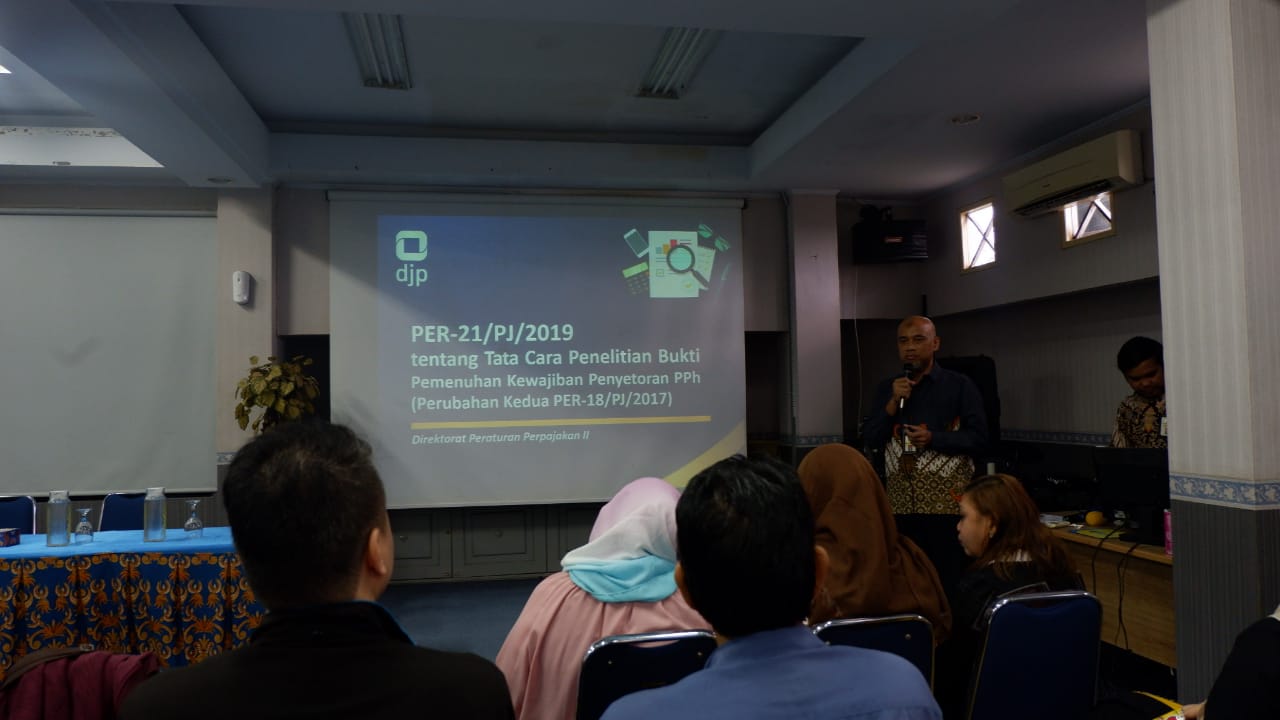 Kantor Pelayanan Pajak menyelenggarakan sosialisasi terkait Peraturan Dirjen Pajak nomor Per-21/PJ/2019 tentang tata cara Penelitian Bukti Pemenuhan Kewajiban Penyetoran PPh atas penghasilan dari pengalihan hak atas tanah dan/atau bangunan dan/atau perubahan PPJB atas tanah dan/atau bangunan (PPHTB) (Selasa, 26/2).