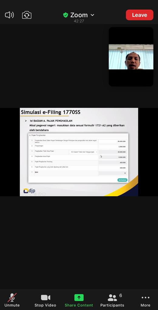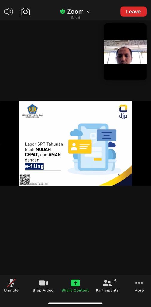 Kantor Pelayanan, Penyuluhan, dan Konsultasi Perpajakan (KP2KP) Pelaihari menyelenggarakan Sosialisasi Edukasi Perpajakan SPT Tahunan Orang Pribadi melalui Zoom Cloud Meetings pukul 14.00 s.d. 15.00 WITA yang dipandu dari gedung KP2KP Pelaihari (Kamis, 10/2).