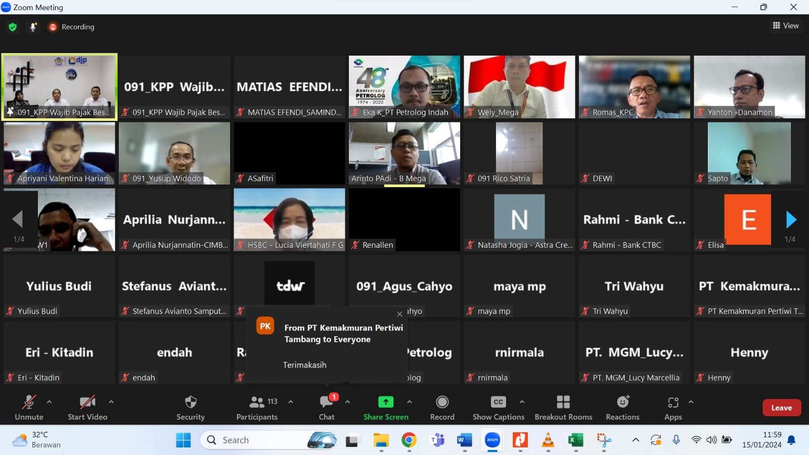 Kantor Pelayanan Pajak (KPP) Wajib Pajak Besar Satu menyapa wajib pajak melalui edukasi perpajakan di awal tahun (15/01). “Peraturan Pemerintah (PP) nomor 58 Tahun 2023 mengenai Tarif Pemotongan Pajak Penghasilan (PPh) Pasal 21 Atas Penghasilan Sehubungan Dengan Pekerjaan, Jasa, atau Kegiatan Wajib Pajak Orang Pribadi” menjadi tema kegiatan yang dilaksanakan melalui media Zoom Cloud Meeting ini.