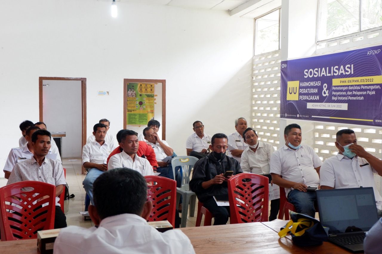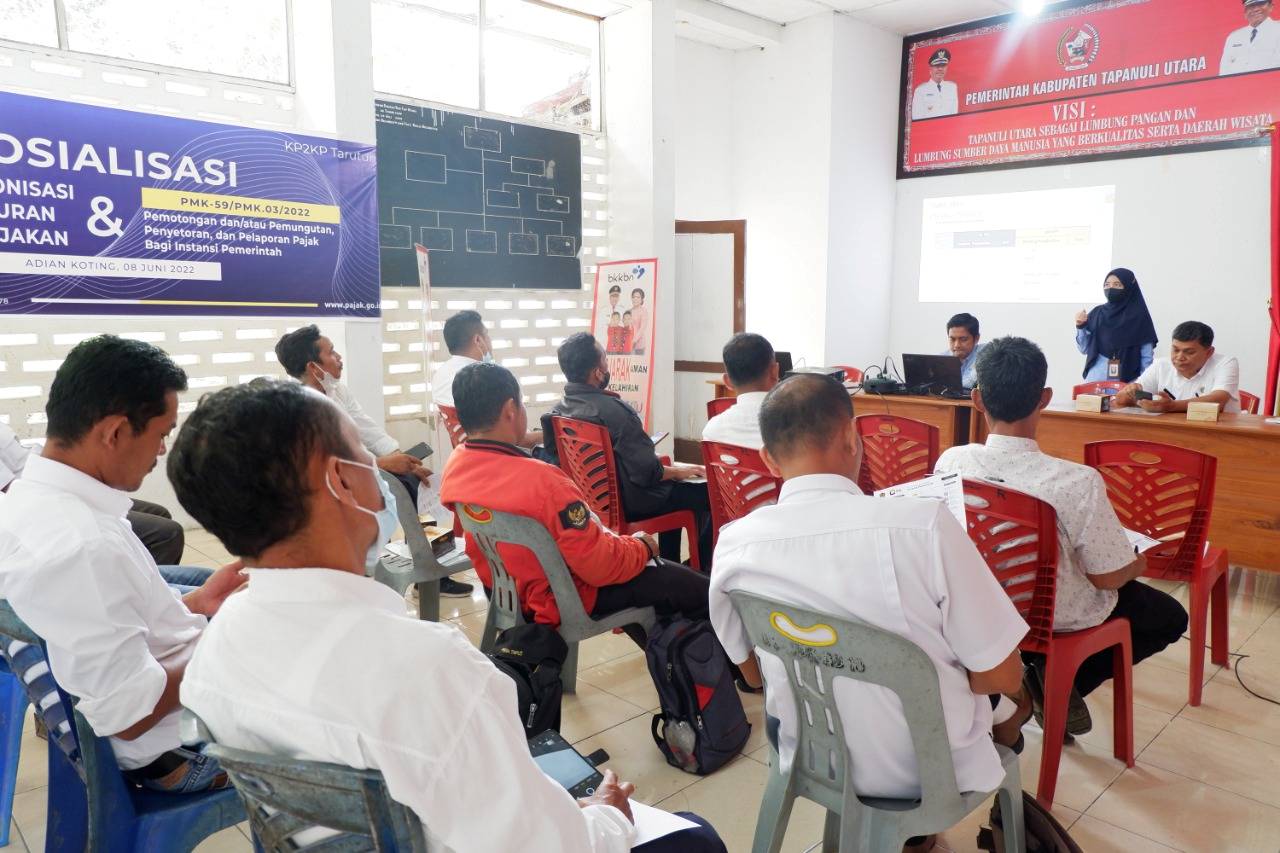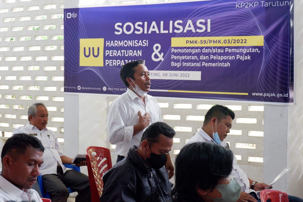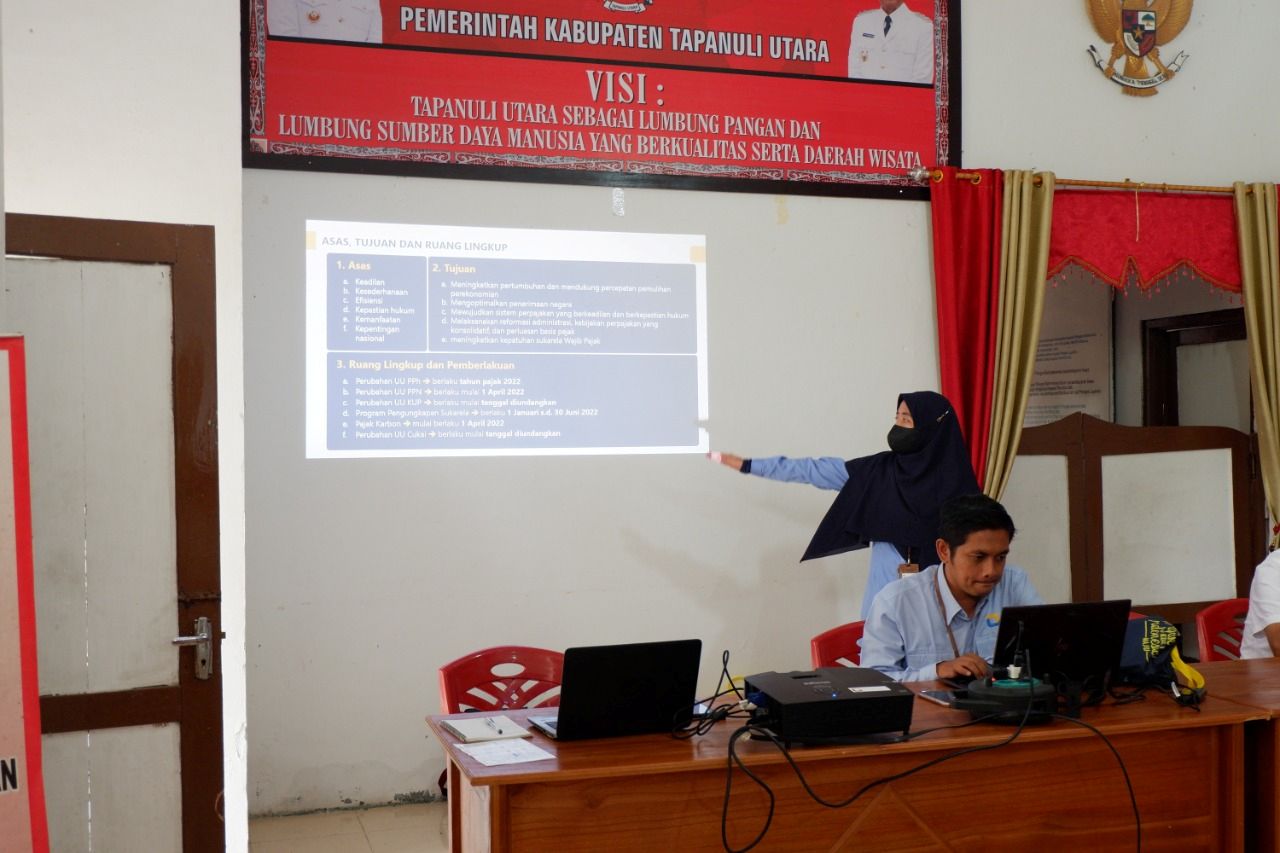 Kantor Pelayanan, Penyuluhan, dan Konsultasi Perpajakan (KP2KP) Tarutung menyelenggarakan Sosialisasi Undang-Undang Harmonisasi Peraturan Perpajakan (UU HPP) dan Peraturan Menteri Keuangan (PMK) Nomor 59/PMK.03/2022 di Kantor Camat Adian Koting, Kabupaten Tapanuli Utara (Rabu, 15/6). Sosialisasi ini dihadiri oleh perwakilan setiap perangkat desa di wilayah Kecamatan Sipoholon.