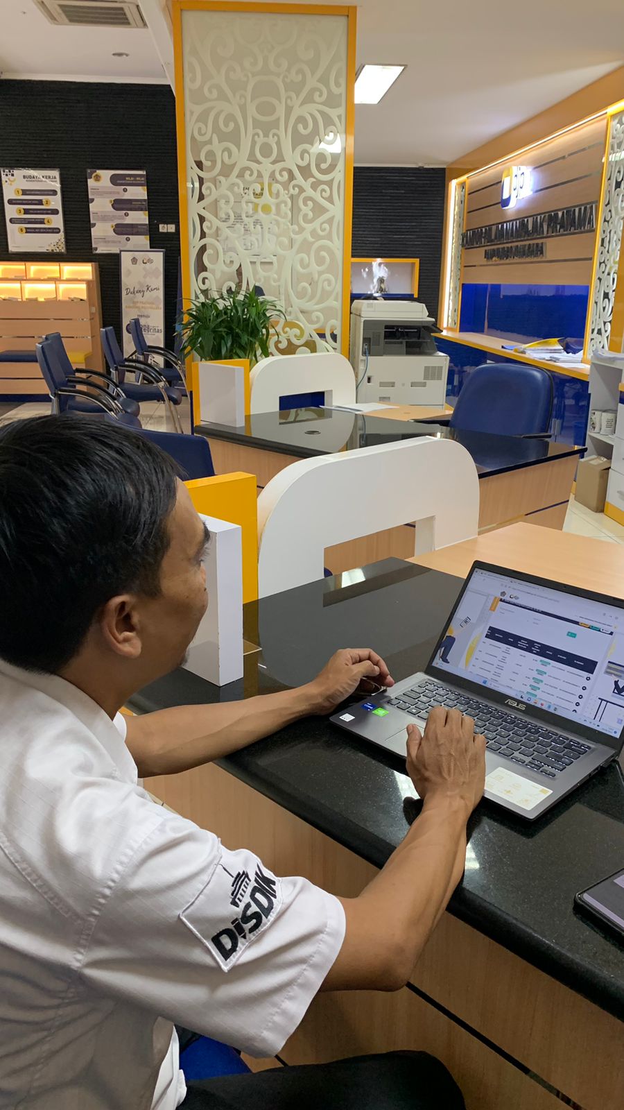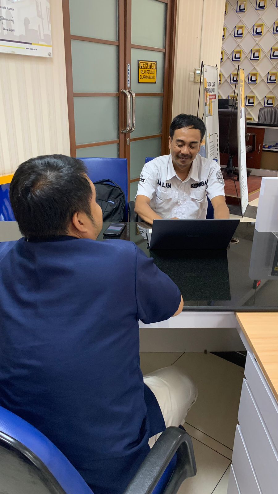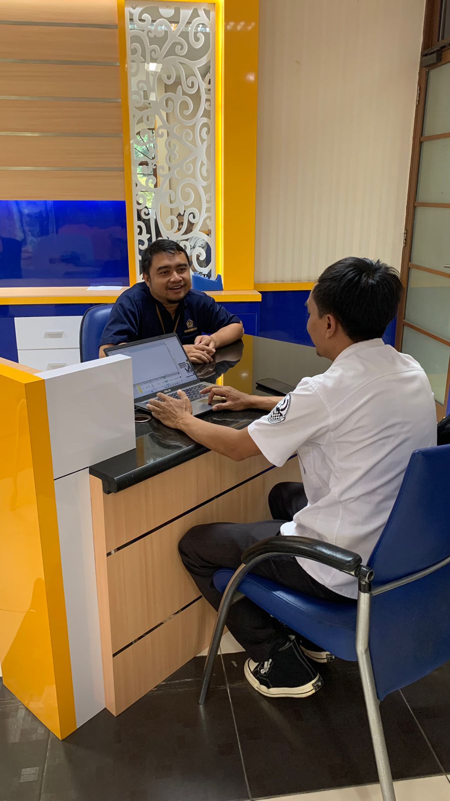 Penyuluh Pajak KPP Pratama Bandung Bojonagara Aris Kurniawan memberikan asistensi kepada seorang wajib pajak terkait Pemutakhiran Data Nomor Induk Kependudukan (NIK) dengan Nomor Pokok Wajib Pajak (NPWP) di loket Helpdesk KPP Pratama Bandung Bojonagara (Rabu, 9/8). Wajib pajak datang ke Kantor Pelayanan Pajak Pratama Bandung Bojonagara untuk menanyakan kabar yang sedang beredar di publik bahwa NIK akan menjadi NPWP.