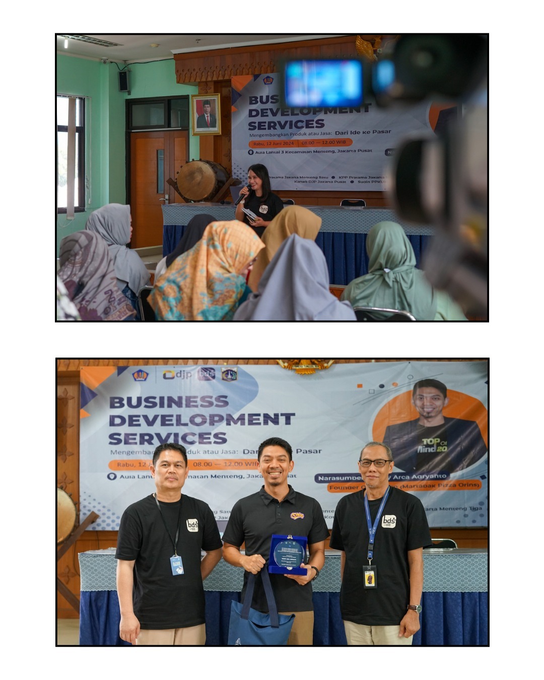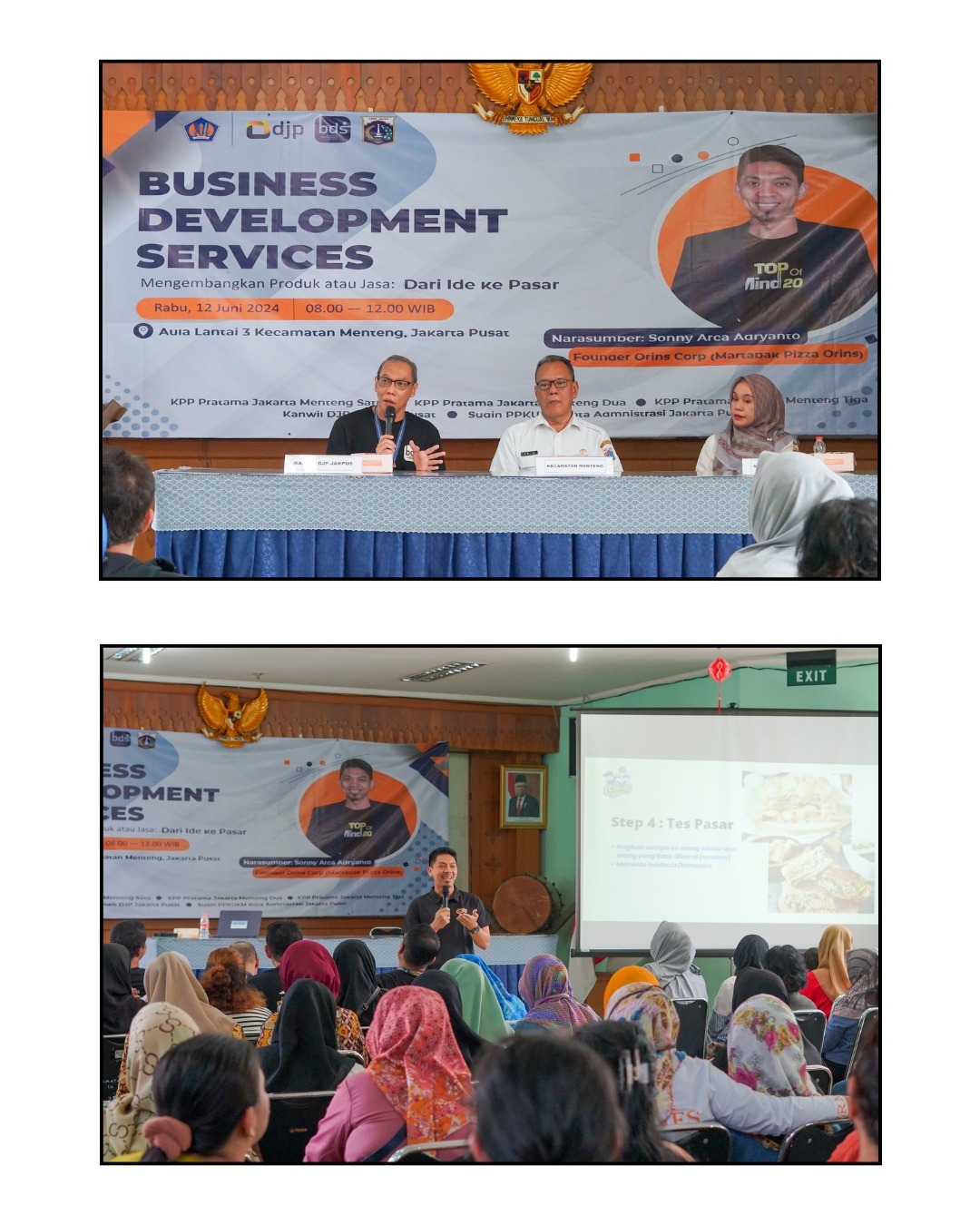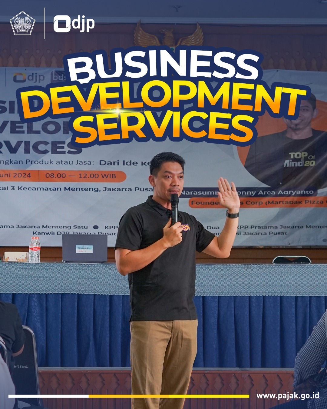 Business Development Services (BDS) adalah program Direktorat Jenderal Pajak terkait pemberian pelatihan dan bimbingan perpajakan dalam program pembinaan UMKM. Program BDS dilaksanakan secara rutin setiap tahun. Kegiatan BDS Tahun 2024 dilaksanakan secara kolaboratif antara Kantor Wilayah DJP Jakarta Pusat, KPP Pratama Jakarta Menteng Satu, KPP Pratama Jakarta Menteng Dua dan KPP Jakarta Menteng Tiga dengan Suku Dinas Perindustrian, Perdagangan, Koperasi, Usaha Kecil dan Menengah Jakarta Pusat (Sudin PPKUKM Jakarta Pusat) dan Kantor Kecamatan Menteng.