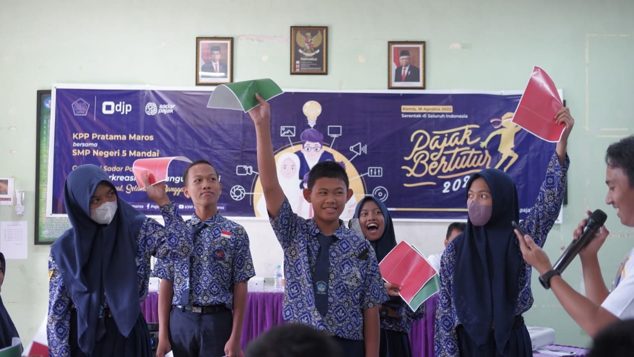 Kantor Pelayanan Pajak (KPP) Pratama Maros bersama Kantor Pelayanan, Penyuluhan, dan Konsultasi Perpajakan (KP2KP) Pangkajene menggelar Pajak Bertutur 2022 di Sekolah Menengah Pertama (SMP) Negeri 5 Mandai dan SMP Negeri 2 Pangkajene secara serentak (Kamis, 18/8). Kegiatan yang memiliki slogan “Sehari Mengenal, Selamanya Bangga” ini dilaksanakan dalam rangka untuk memeriahkan Hari Ulang Tahun Republik Indonesia ke-77 sekaligus mengampanyekan program inklusi pajak yang diusung oleh Kementerian Keuangan dan Direktorat Jenderal Pajak (DJP).
