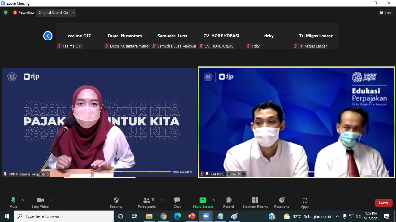 Tim Penyuluh Pajak Kantor Wilayah (Kanwil) DJP Jawa Timur II bersama Tim Penyuluh Pajak Kantor Pelayanan Pajak (KPP) Pratama Mojokerto menyelenggarakan edukasi perpajakan bagi wajib pajak strategis yang belum menyampaikan Surat Pemberitahuan (SPT) Tahunan. Acara dilangsungkan secara daring di KPP Pratama Mojokerto, Kabupaten Mojokerto mulai pukul 13.00 sampai 14.30 WIB (Senin, 13/9).