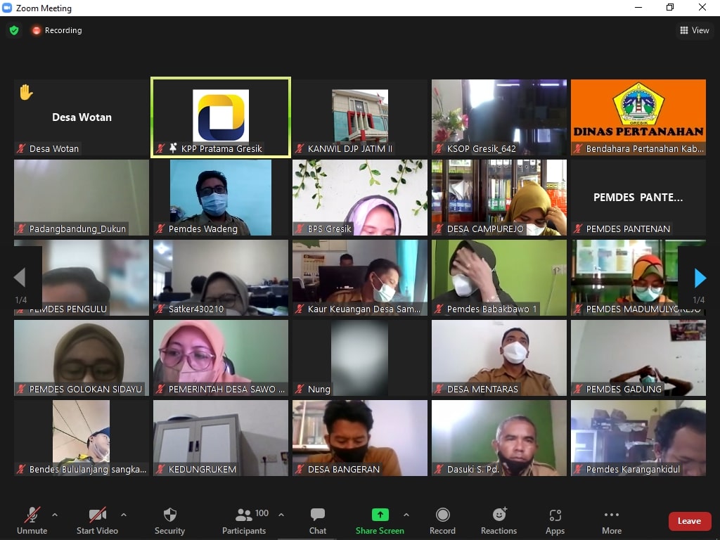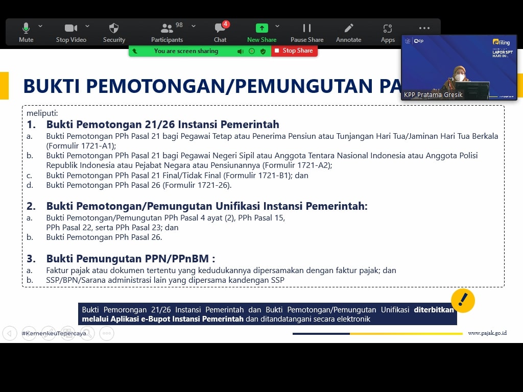 Kantor Pelayanan Pajak (KPP) Pratama Gresik berkolaborasi dengan Kantor Wilayah (Kanwil) DJP Jawa Timur II mengadakan kegiatan edukasi perpajakan terkait tata cara pembuatan bukti pemotongan/pemungutan pajak dan SPT Masa sesuai PER-17/PJ/2021. Kegiatan ini dilaksanakan secara daring di Gedung KPP Pratama Gresik, Kabupaten Gresik dan diikuti kurang lebih 90 Bendahara Instansi Pemerintah melalui media Zoom Cloud Meeting (Selasa, 7/9).