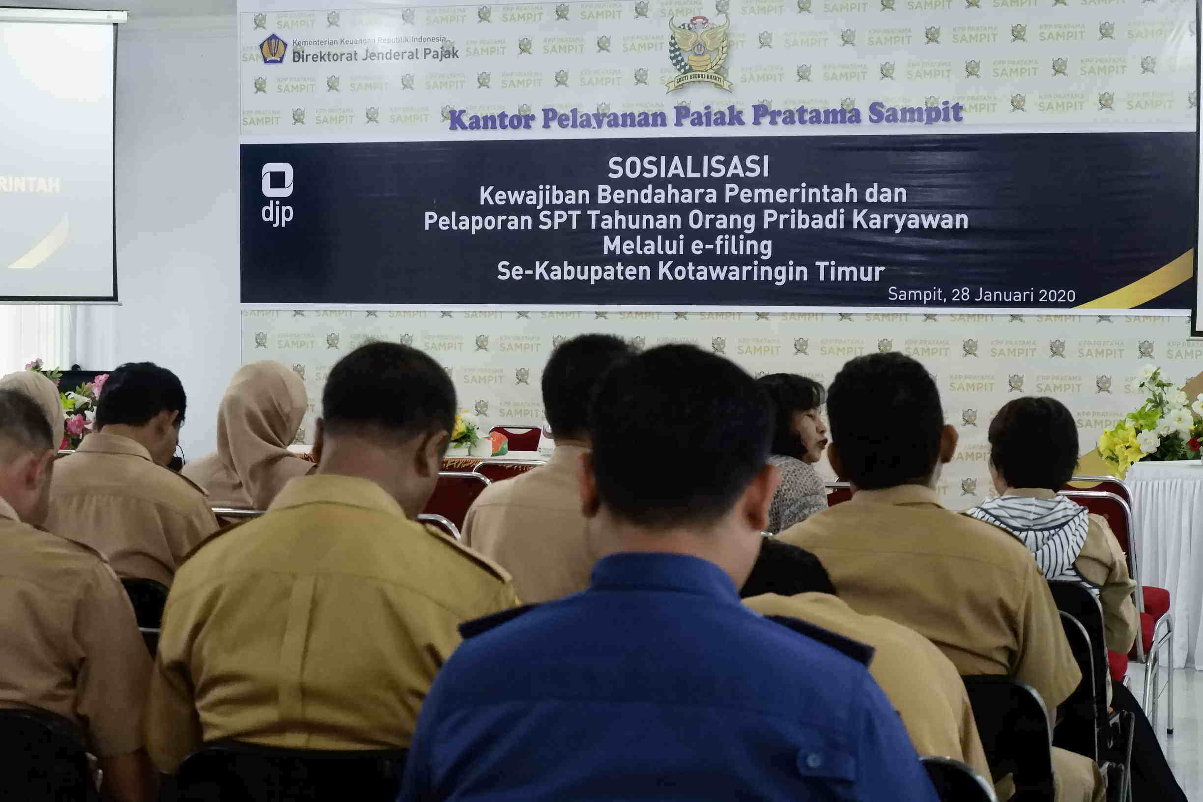 KPP Pratama Sampit mengadakan acara Sosialisasi Kewajiban Bendahara Pemerintah dan Pelaporan SPT Tahunan Orang Pribadi Karyawan melalui e-Filing se-Kabupaten Kotawaringin Timur, bertempat di aula KPP Pratama Sampit (Selasa, 28/1).