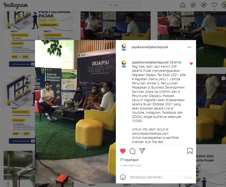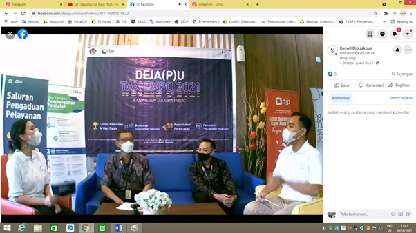 Kantor Wilayah DJP Jakarta Pusat memulai kegiatan DEJA(P)U TAX EXPO 2021 di area Lobby Kantor Wilayah DJP Jakarta Pusat (Jumat, 1/10). DEJA(P)U TAX EXPO 2021 ini menyelenggarakan beberapa kegiatan yang terdiri dari lomba penulisan artikel pajak, edukasi perpajakan, Business Development Services (BDS), dan peluncuran DEJA(P)U Podcast.