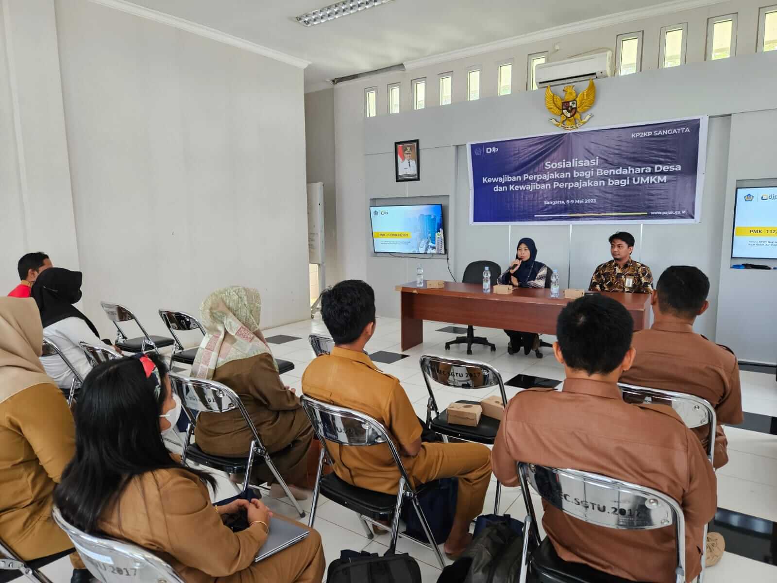 Kantor Pelayanan Pajak (KPP) Pratama Bontang menjadi narasumber di acara Sosialisasi Hak dan Kewajiban Bendaharawan Desa dan e-Bupot Unifikasi khususnya bagi bendahara desa di Kecamatan Sangatta Utara dan Sangatta Selatan yang diadakan oleh Kantor Pelayanan, Penyuluhan, dan Konsultasi Perpajakan (KP2KP) Sangatta di Kantor Desa Sangatta Utara, Kab. Kutai Timur (Selasa, 9/5). Jumlah peserta yang hadir mengikuti kelas pajak ini sebanyak 16 peserta yang merupakan perangkat desa yang ada di dua kecamatan di Kutai Timur.
