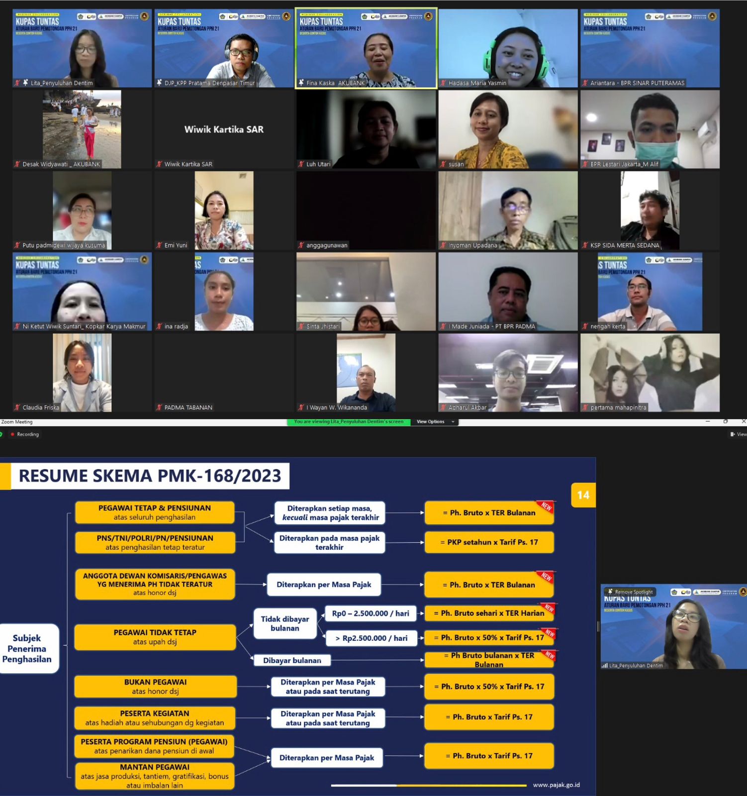 Asisten Penyuluh Pajak KPP Pratama Denpasar Timur Nurlita Kumala Sani juga memberikan berbagai contoh kasus terkait aturan baru PPh 21 ini kepada peserta webinar. Nurlita mengingatkan para pemberi kerja wajib memperhatikan detil aturan baru ini karena terdapat perubahan terkait cara perusahaan dalam menghitung, memotong, dan melaporkan pajak penghasilan karyawan.