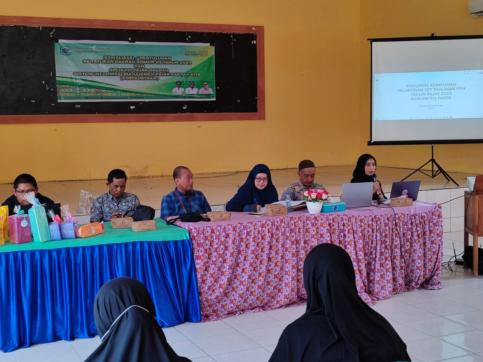Setelah sesi materi dari Badan Pendapatan Daerah Kabupaten Paser, Penyuluh KPP Pratama Penajam Mita Rizki menyampaikan progres kepatuhan pelaporan Surat Pemberitahuan (SPT) Tahunan Pajak Penghasilan (PPh) Wajib Pajak Orang Pribadi non karyawan Tahun Pajak 2023 di Kabupaten Paser, khususnya di wilayah Kecamatan Pasir Belengkong.