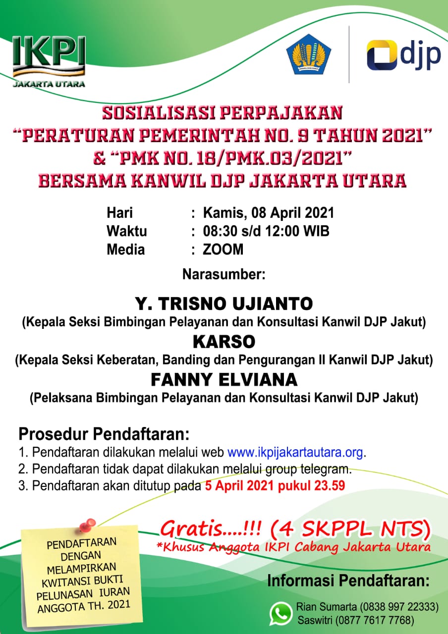 Ikatan Konsultan Pajak Indonesia (IKPI) Cabang Jakarta Utara mengadakan Sosialisasi Perpajakan “Peraturan Pemerintah Nomor 9 Tahun 2021 & Peraturan Menteri Keuangan Nomor 18/PMK.03/2021” bersama Kantor Wilayah (Kanwil) Direktorat Jenderal Pajak (DJP) Jakarta Utara di Jakarta (Kamis, 8/4).