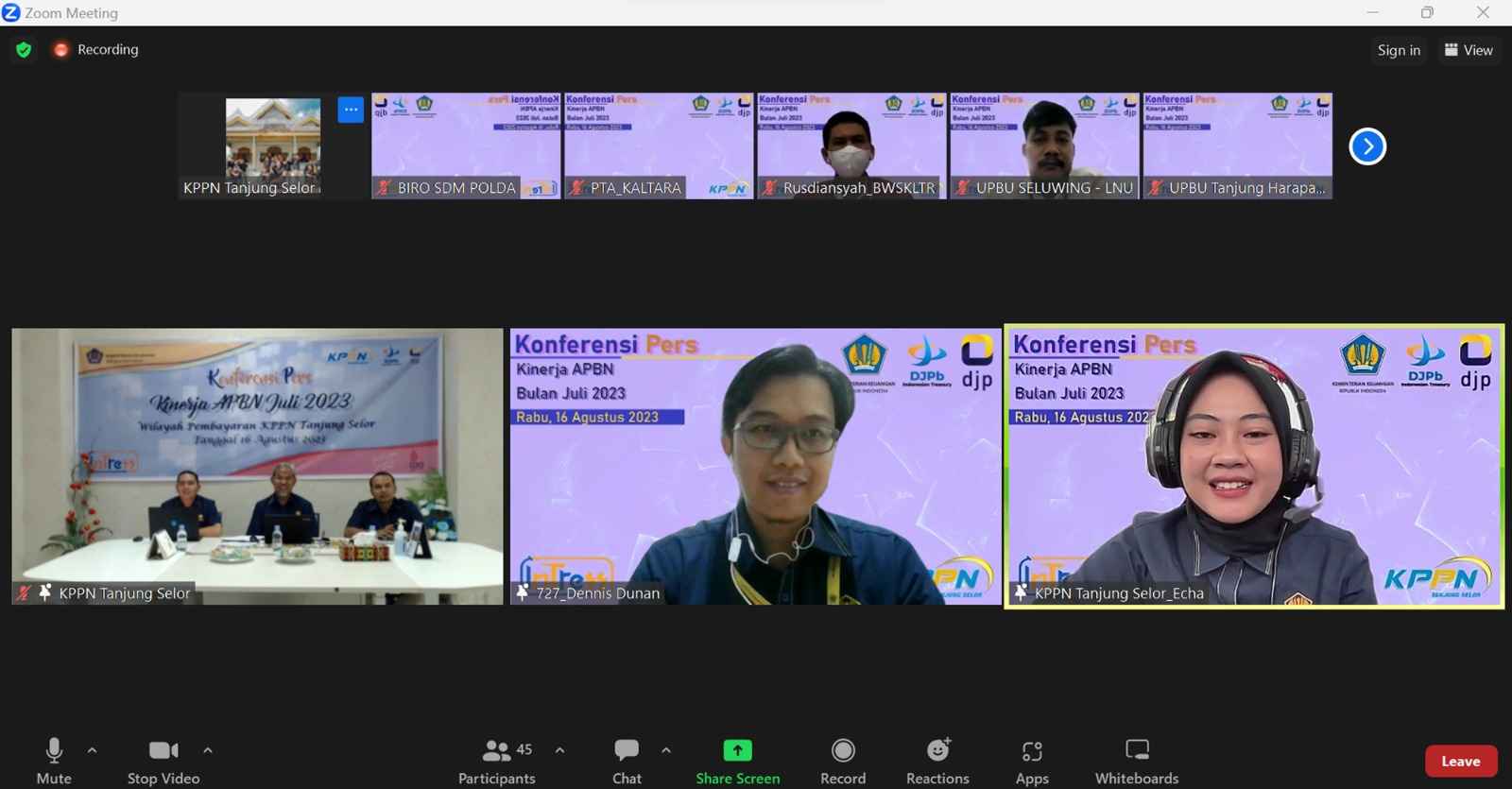 Kepala Seksi Pengawasan III Kantor Pelayanan Pajak (KPP) Pratama Tanjung Redeb Dennis Dunan menghadiri acara Konferensi Pers Kinerja APBN Juli 2023 yang diadakan oleh Kantor Pelayanan Perbendaharaan Negara (KPPN) Tipe A1 untuk Wilayah Pembayaran KPPN Tanjung Selor yang meliputi Kabupaten Bulungan dan Kabupaten Malinau secara daring via aplikasi Zoom Meeting di Kota Tarakan (Rabu, 16/8).
