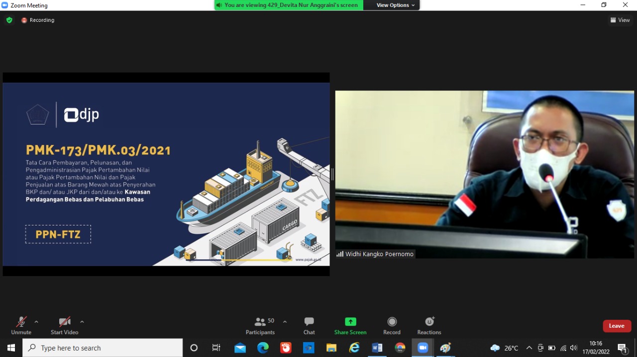 Kegiatan ini mengangkat topik PMK-173/PMK.03/2021 tentang Tata Cara Pembayaran, Pelunasan, dan Pengadministrasian Pajak Pertambahan Nilai atau Pajak Pertambahan Nilai dan Pajak Penjualan atas Barang Mewah atas Penyerahan BKP dan/atau JKP dari dan/atau ke Kawasan Perdagangan Bebas dan Pelabuhan Bebas.