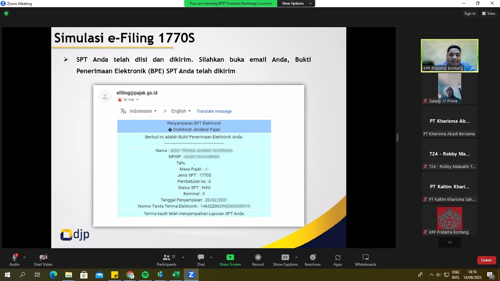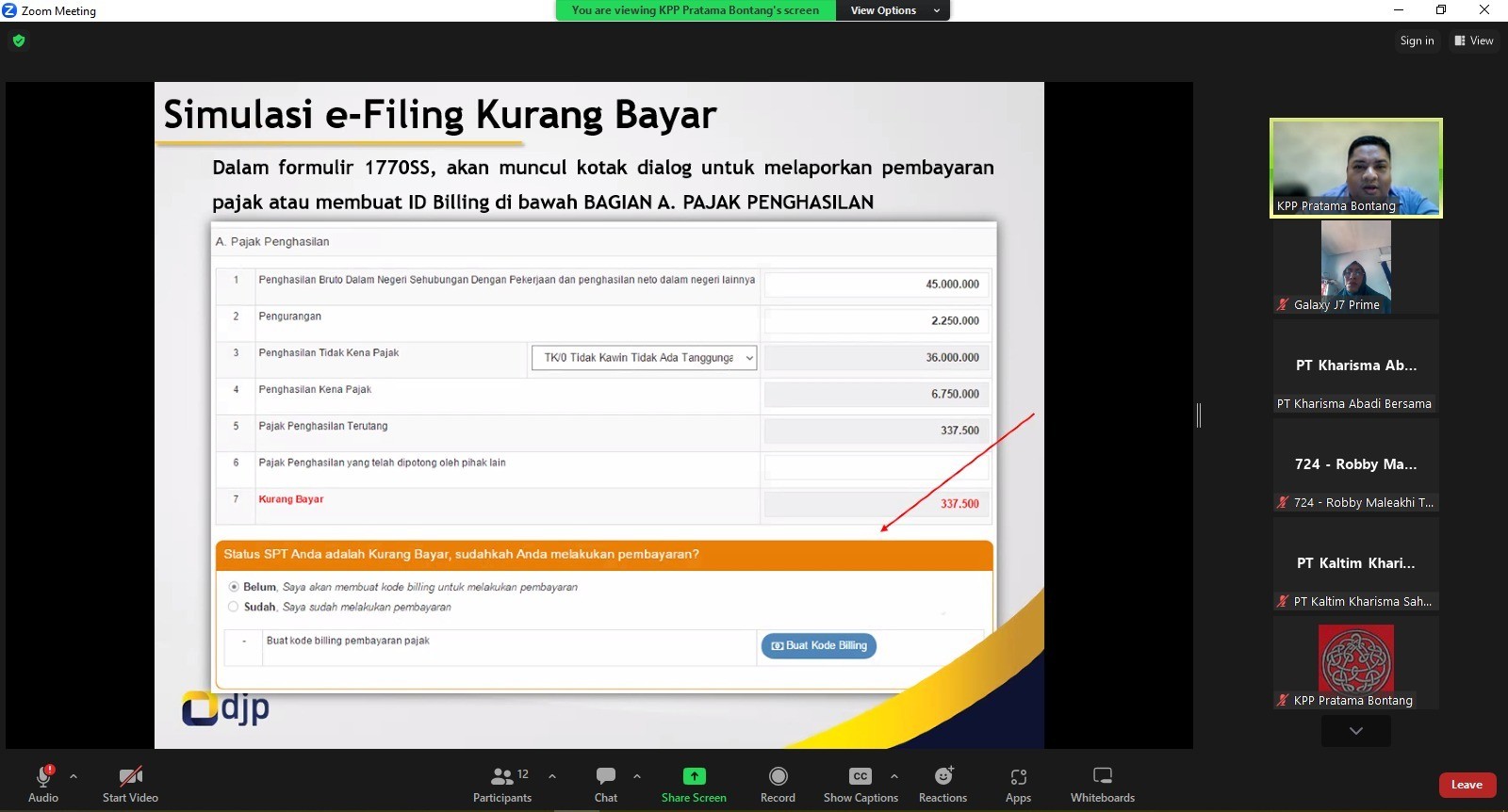 Kantor Pelayanan Pajak (KPP) Pratama Bontang kembali mengadakan kelas pajak online bertema Tata Cara Pelaporan Surat Pemberitahuan (SPT) Tahunan Pajak Penghasilan (PPh) Orang Pribadi di Kota Bontang (Kamis, 14/9). Kelas pajak online merupakan kegiatan rutin yang diselenggarakan KPP Pratama Bontang setiap pekan.