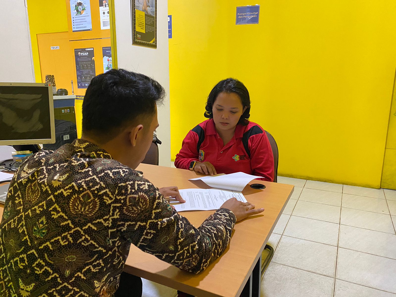 Salah seorang wajib pajak dari Dinas Kesehatan Kabupaten Melawi melakukan konsultasi terkait pengenaan pajak atas jasa konsultan terkait konstruksi bersama dengan Iqbal Pasuja, Petugas penyuluhan Kantor Pelayanan, Penyuluhan, dan Konsultasi Perpajakan (KP2KP) Nanga Pinoh di ruang konsultasi KP2KP Nanga Pinoh, Kabupaten Melawi (Jumat, 20/9).