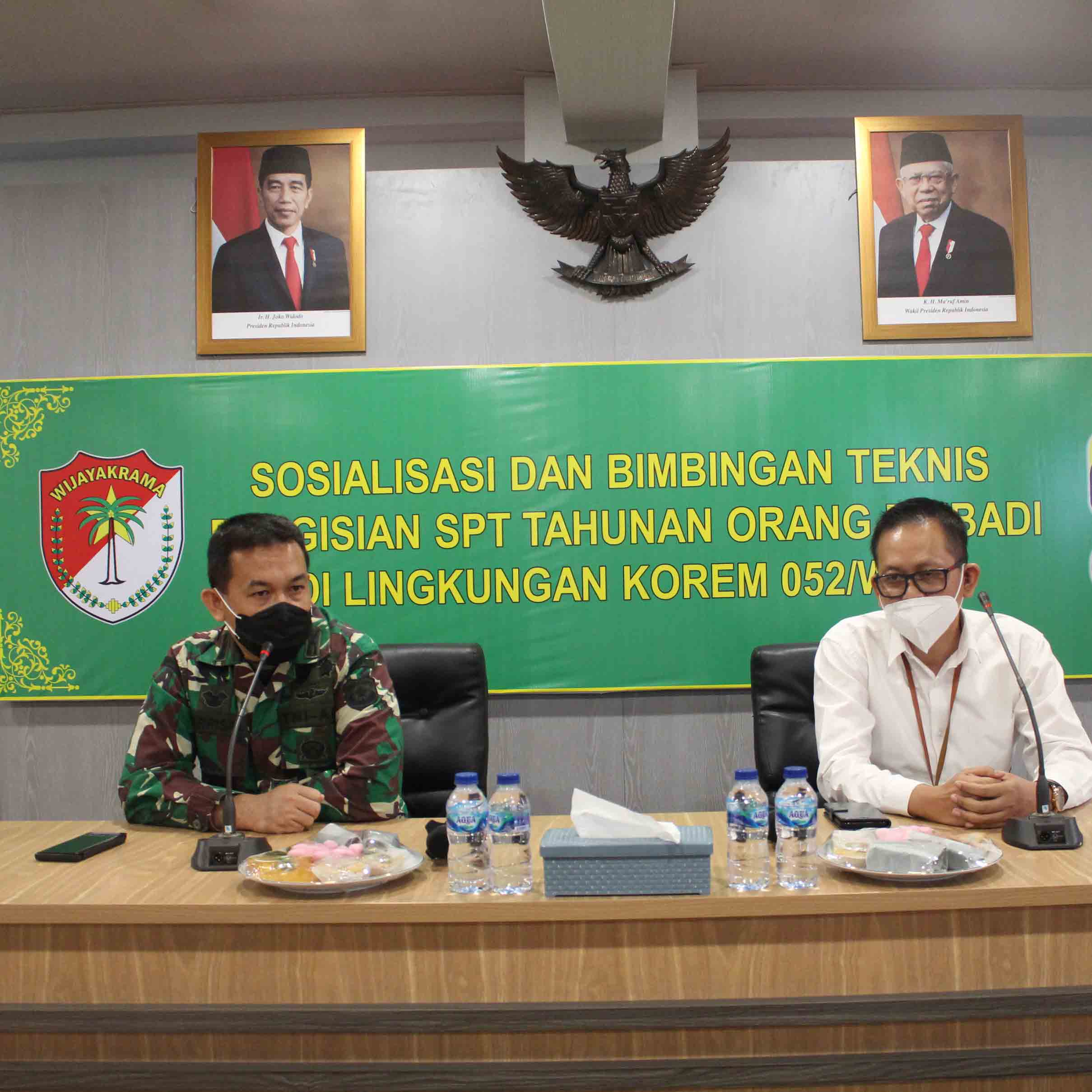 Kegiatan tersebut diawali dengan pertemuan Kepala Kantor Wilayah (Kanwil) Direktorat Jenderal Pajak (DJP) Banten Dionysius Lucas Hendrawan dengan Komandan Korem 052 Brigjen TNI Purwito Hadi Wardhono dalam rangka pekan panutan SPT Tahunan 2021.