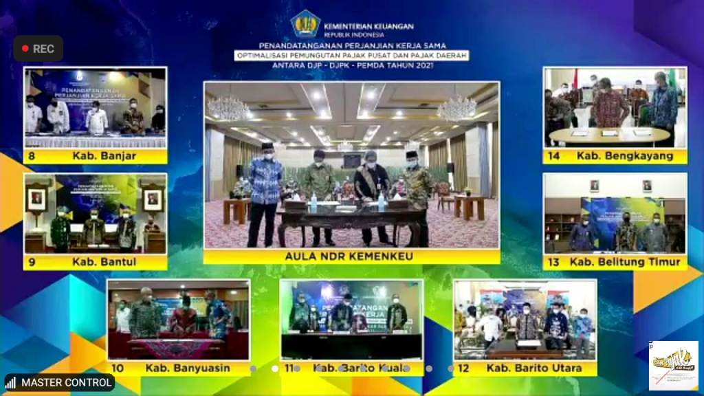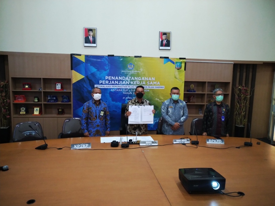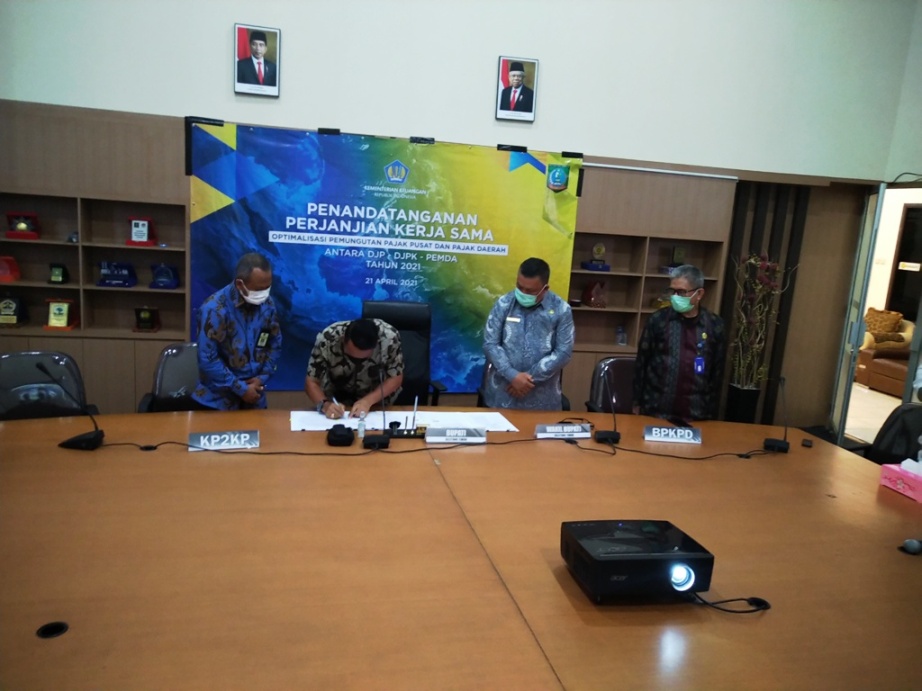 Bupati Belitung Timur Burhanudin menandatangani perjanjian kerja sama dengan Direktorat Jenderal Pajak (DJP) dan Direktorat Jenderal Perimbangan Keuangan (DJPK) untuk mengoptimalkan penerimaan pajak pusat dan pajak daerah di Ruang Rapat Bupati Belitung Timur, Kepulauan Bangka Belitung (Selasa, 21/4).