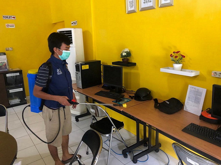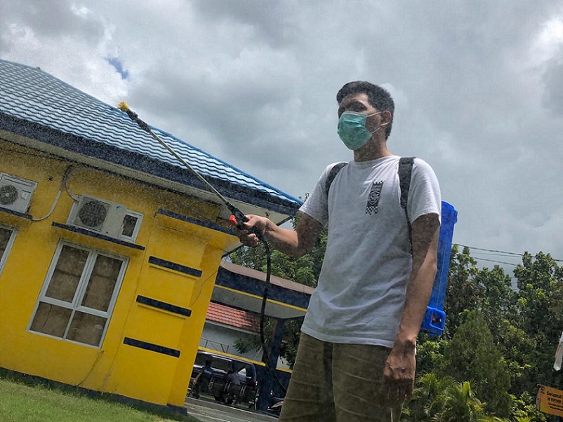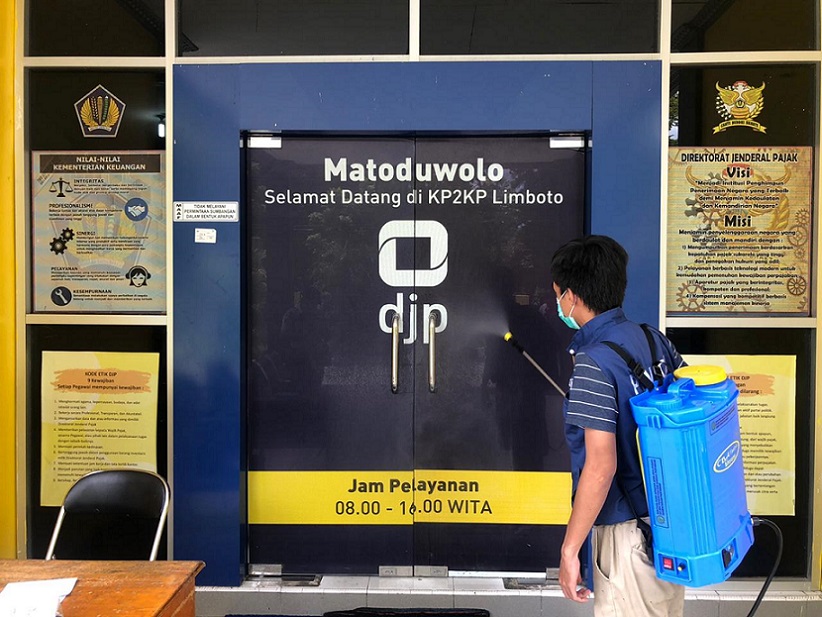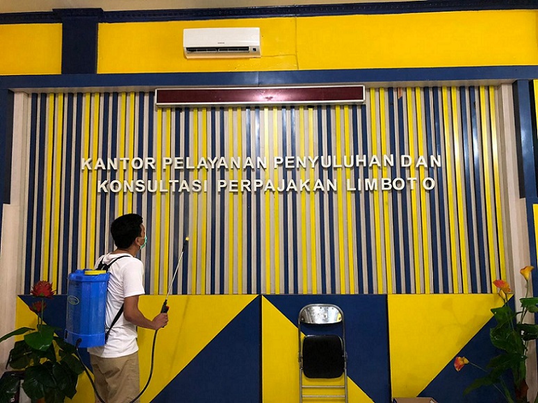 Kantor Pelayanan Penyuluhan dan Konsultasi Perpajakan (KP2KP) Limboto bersinergi dengan Dinas Kesehatan Kabupaten Gorontalo melakukan penyemprotan disinfektan untuk mencegah Corona Virus Disease 2019 (COVID-19) di seluruh wilayah KP2KP Limboto (Minggu, 31/5).