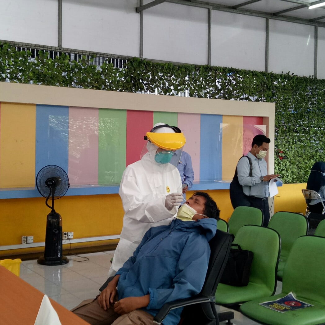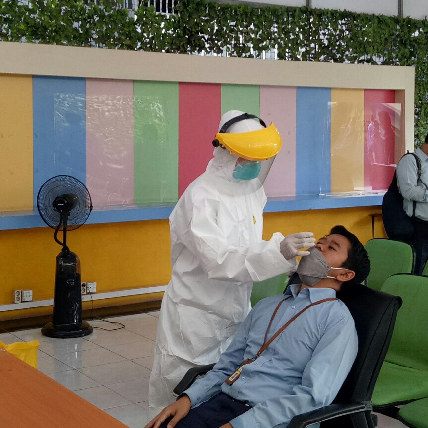 Sebelum memasuki ruangan, seluruh pegawai diwajibkan mencuci tangan terlebih dahulu dan tetap menjaga jarak selama menunggu antrean tes. Pegawai juga diwajibkan untuk tetap mengenakan masker saat kegiatan berlangsung.