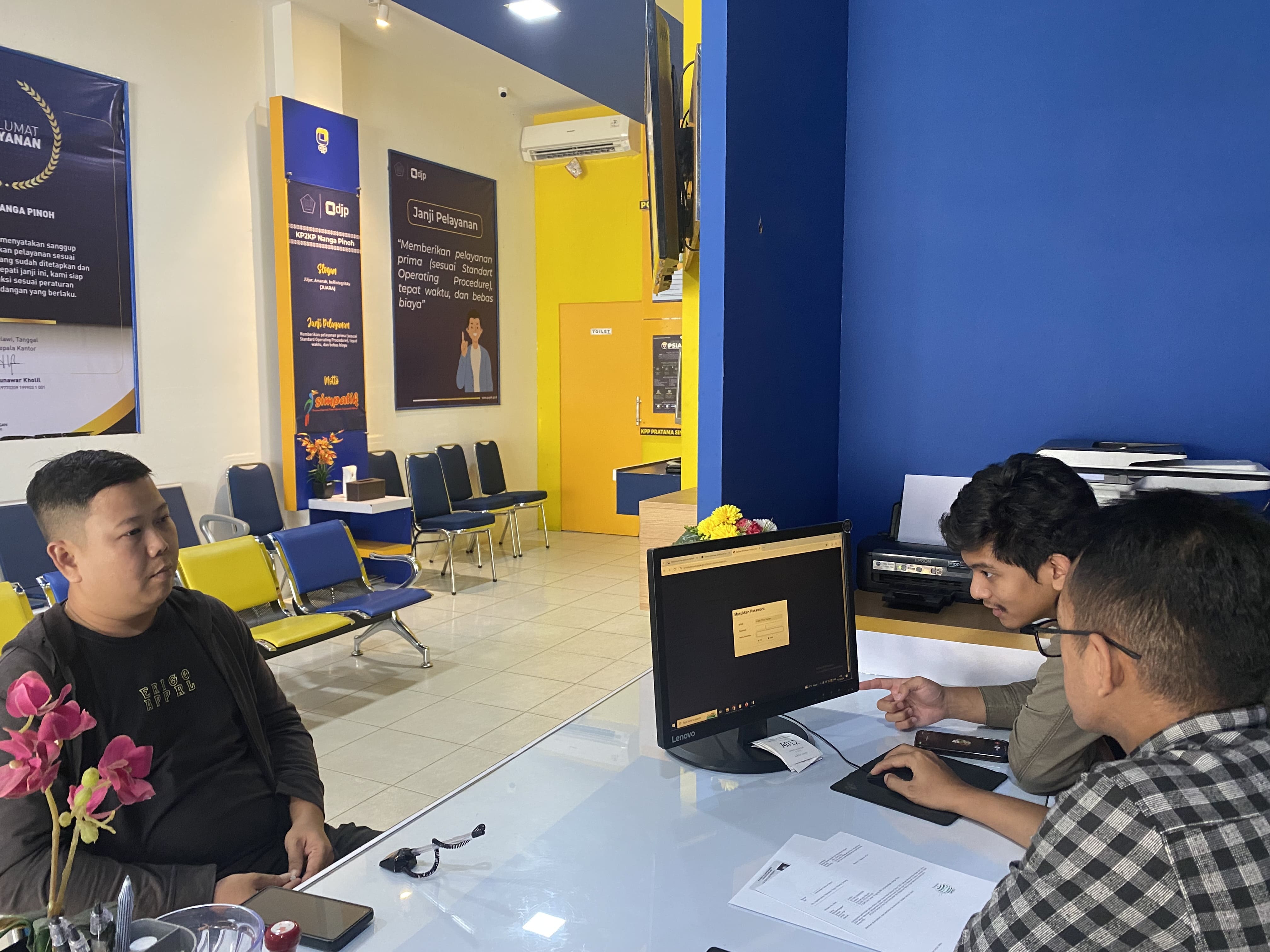 Salah seorang wajib pajak melakukan konsultasi terkait e-Faktur bersama dengan Petugas Penyuluhan Kantor Pelayanan, Penyuluhan, dan Konsultasi Perpajakan (KP2KP) Nanga Pinoh di ruang tempat pelayanan terpadu (TPT) KP2KP Nanga Pinoh, Kabupaten Melawi (Kamis, 1/8). Wajib Pajak tersebut merupakan seorang direktur dari sebuah perusahaan yang telah dikukuhkan sebagai Pengusaha Kena Pajak (PKP).