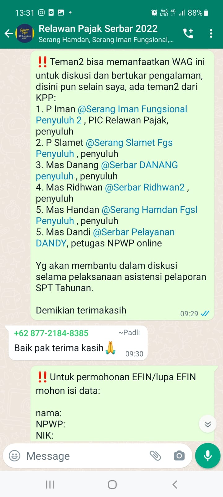 Kantor Pelayanan Pajak (KPP) Pratama Serang Barat melakukan pendampingan Relawan Pajak melalui saluran WhatsApp sebagai olusi atas kendala yang ditemui para relawan pajak saat melakukan asistensi pengisian SPT Tahunan kepada Wajib Pajak dari KPP Pratama Serang Barat, Kota Serang (Senin, 21/03).