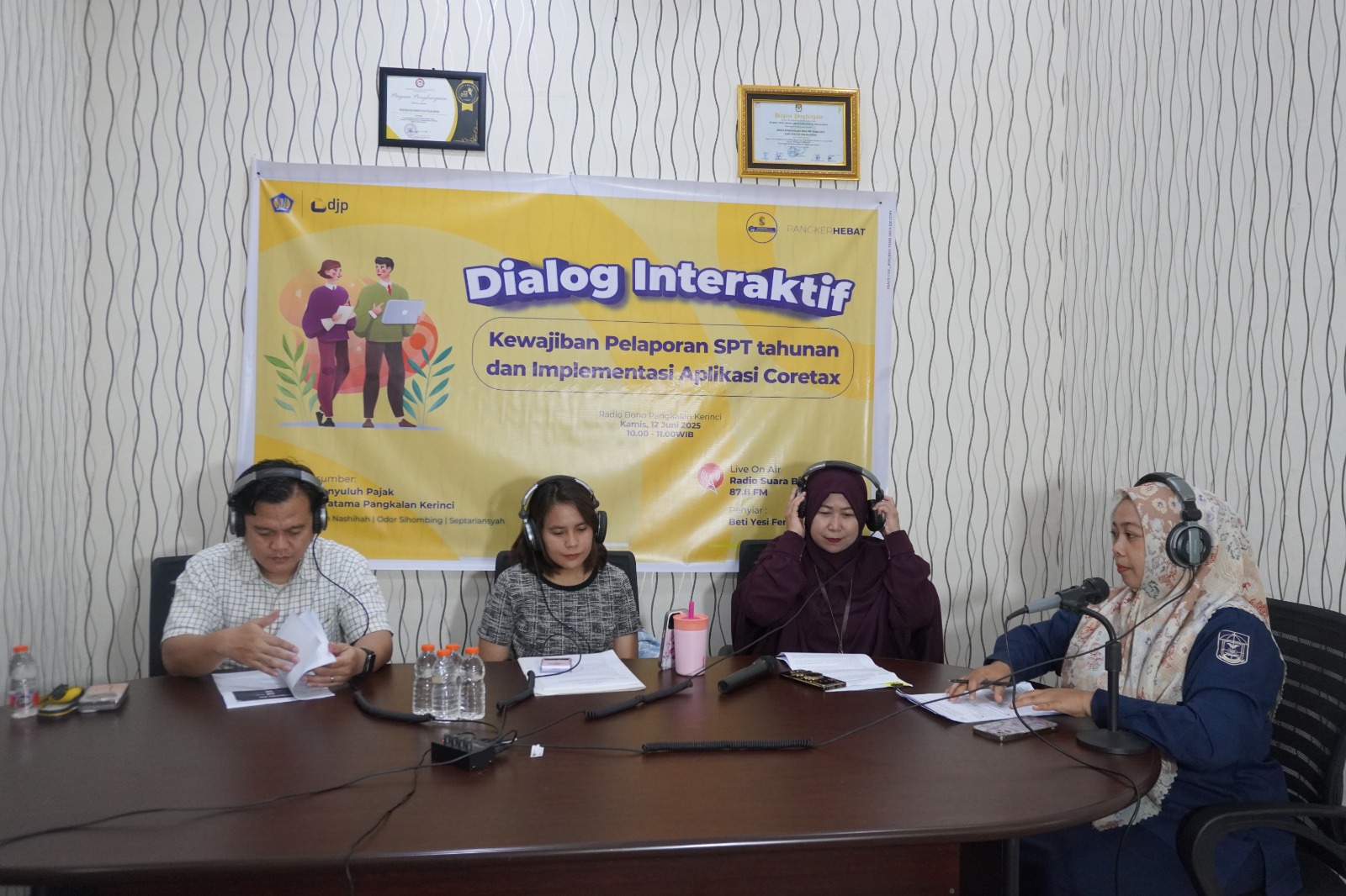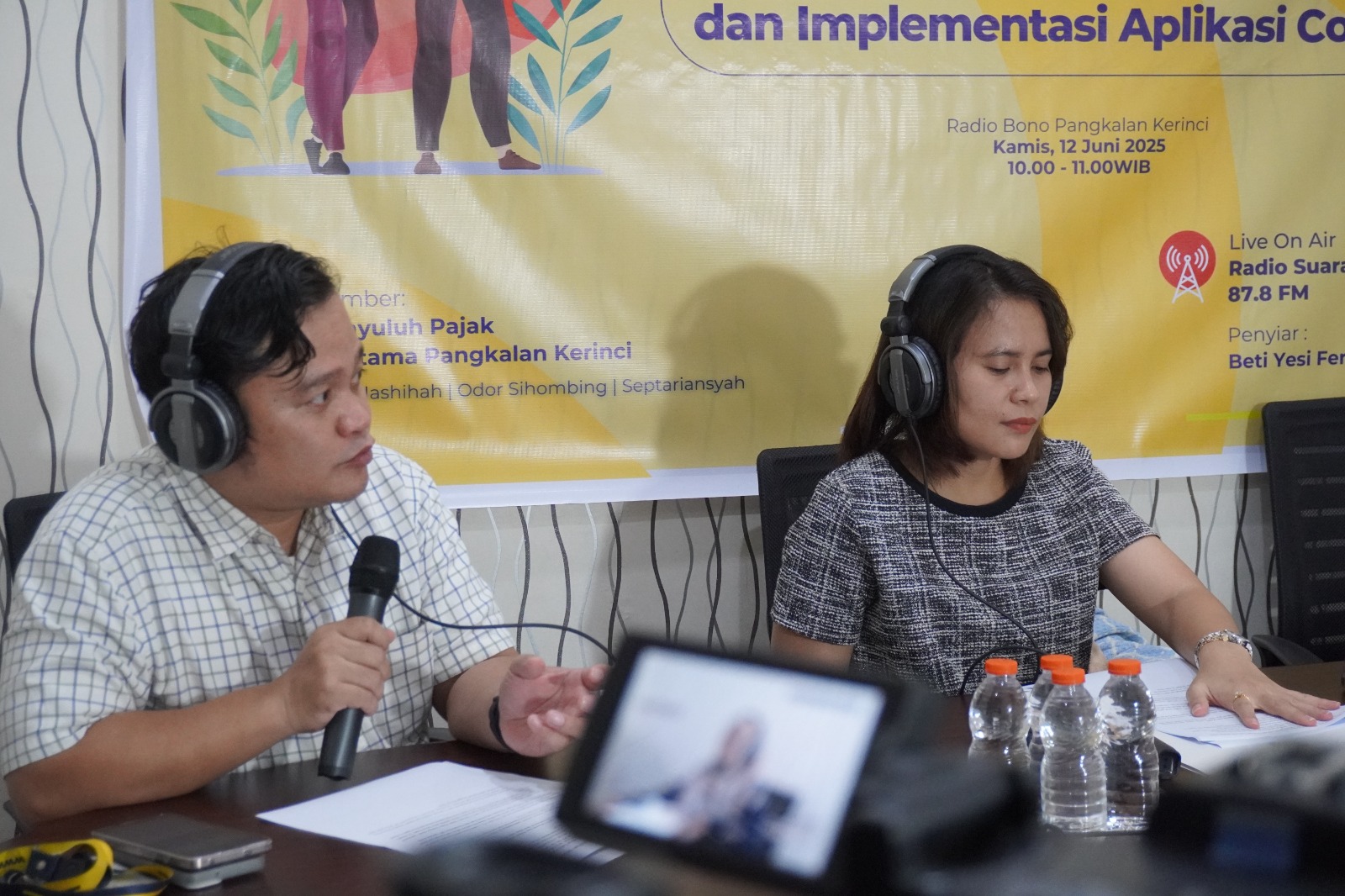 Kantor Pelayanan Pajak (KPP) Pratama Pangkalan Kerinci terus menggencarkan edukasi perpajakan kepada masyarakat melalui dialog interaktif bertajuk “Pelaporan SPT Tahunan dan Implementasi Aplikasi Coretax” dan disiarkan langsung dari studio Radio Suara Bono FM 87.8, milik Pemerintah Daerah Kabupaten Pelalawan melalui Dinas Komunikasi dan Informatika (Kamis, 12/6)