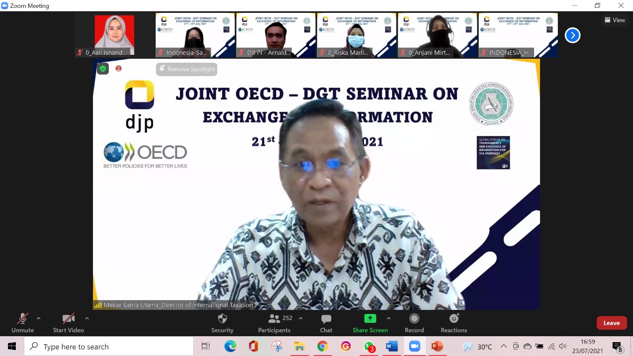 Direktorat Jenderal Pajak (DJP) bersama Organisasi Ekonomi Internasional OECD (Organisation for Economic Co-operation and Development) menyelenggarakan seminar bertajuk “Joint OECD-DGT Seminar on Exchange of Information 2021” melalui media telekonferensi yang dipandu dari gedung Kantor Pusat DJP, di Jakarta (Rabu, 21/7).