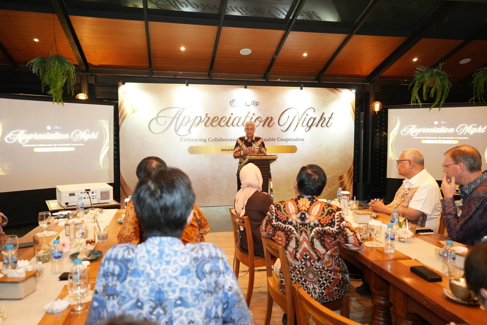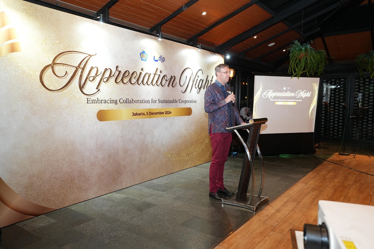 Direktorat Jenderal Pajak (DJP) memberikan apresiasi kepada para mitra internasional dalam kegiatan Appreciation Night: Embracing Collaboration for Sustainable Cooperation yang digelar di Bale Nusa, Jakarta (Kamis, 5/12). Pada kesempatan ini, hadir belasan perwakilan dari duta besar dan organisasi internasional mitra.