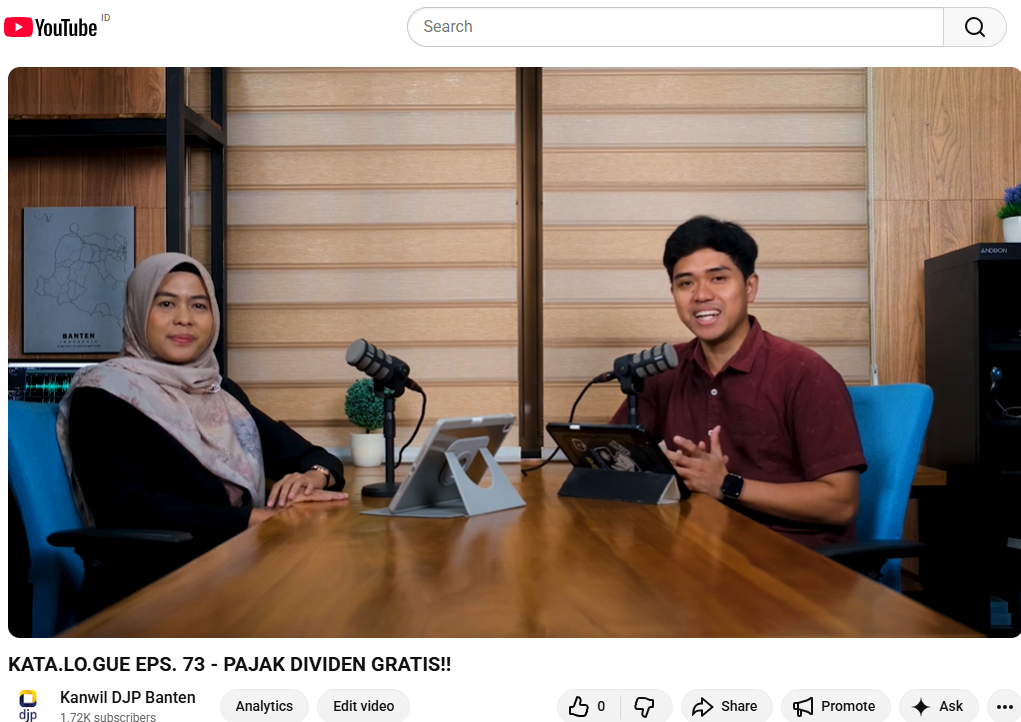 Konsisten dalam memperluas edukasi perpajakan, Kantor Wilayah Direktorat Jenderal Pajak (Kanwil DJP) Banten kembali menayangkan siniar (podcast) "Kata.Lo.Gue" dalam episode ke-73 yang membahas perlakuan pajak atas penghasilan dividen dari investasi. Episode siniar ini berkolaborasi dengan Kantor Pelayanan Pajak (KPP) Pratama Tangerang Barat dan tayang di kanal resmi Youtube Kanwil DJP Banten (Jumat, 13/3).