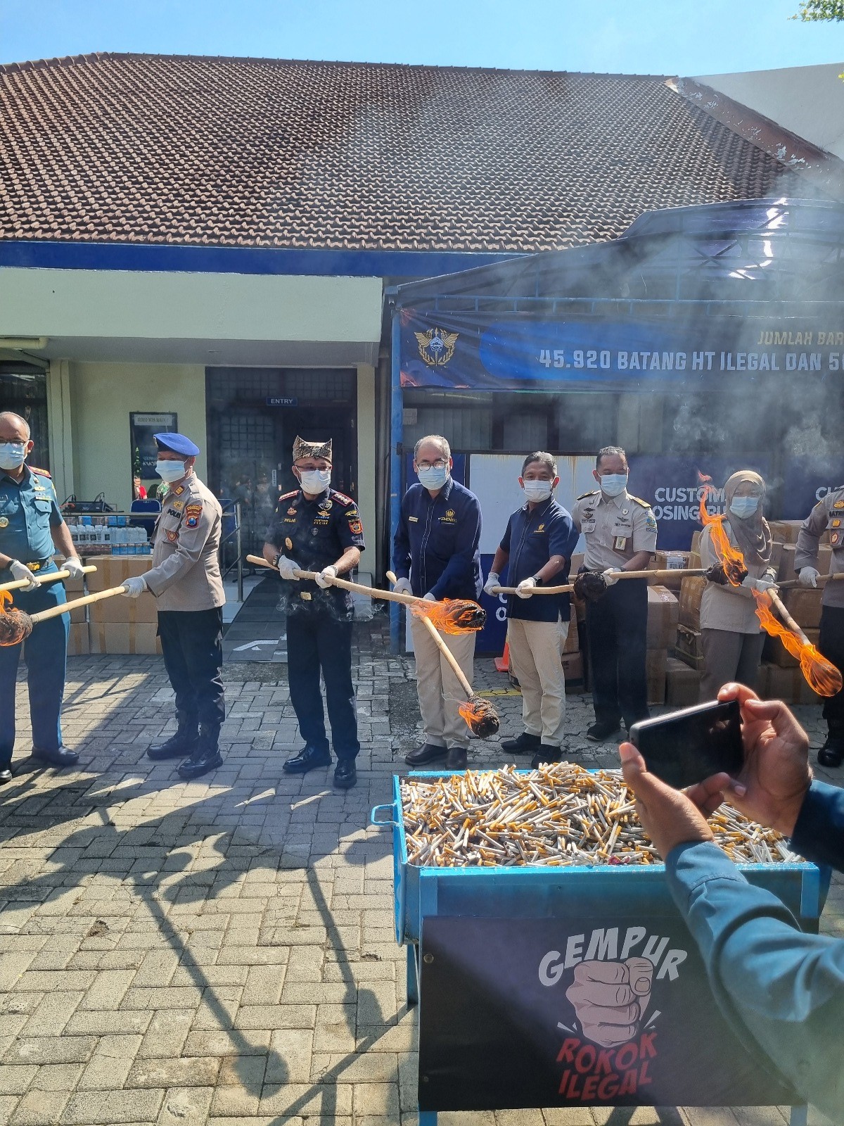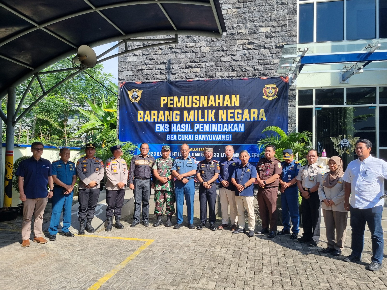 Kepala Kantor Pelayanan Pajak (KPP) Pratama Banyuwangi Ahmad Fudholi bersama Kepala Kantor Bea dan Cukai Banyuwangi Latif Helmi secara bersama-sama melakukan pemusnahan Barang Milik Negara (BMN) eks hasil penindakan Kantor Bea dan Cukai Banyuwangi. Kegiatan pemusnahan BMN dilaksanakan di halaman Kantor Bea dan Cukai Banyuwangi, Jalan Raya Situbondo-Banyuwangi No. 37, Bulusan, Kalipuro, Banyuwangi, Jawa Timur (Rabu, 12/6).