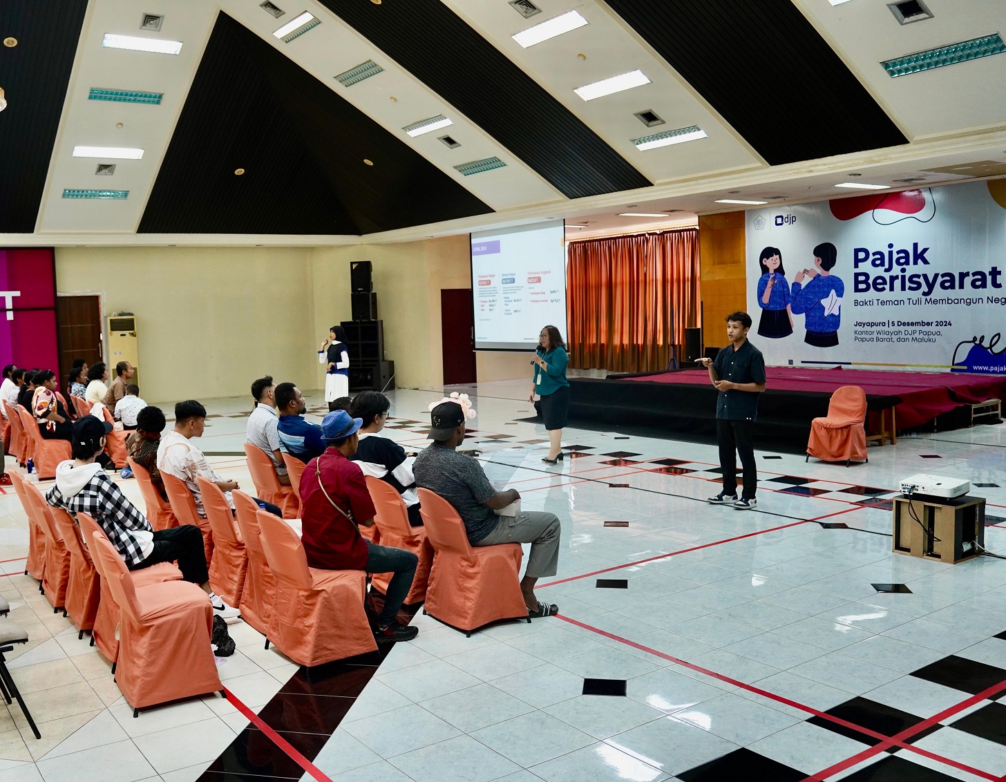 Kantor Wilayah Direktorat Jenderal Pajak Papua, Papua Barat, dan Maluku (Kanwil DJP Papabrama) bersama Komunitas Tuli Jayapura menyelenggarakan kegiatan Pajak Berisyarat bertempat di Aula Lantai 3 Kanwil DJP Papabrama, Kota Jayapura (Kamis, 5/12).