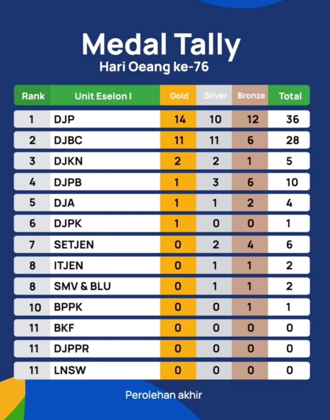 DJP unggul secara meyakinkan dengan mengumpulkan 14 emas, 10 perak, dan 12 perunggu. Jumlah ini melampaui Direktorat Bea dan Cukai yang berada di posisi kedua dengan perolehan medali sebanyak 11 emas, 11 perak, dan 6 perunggu.