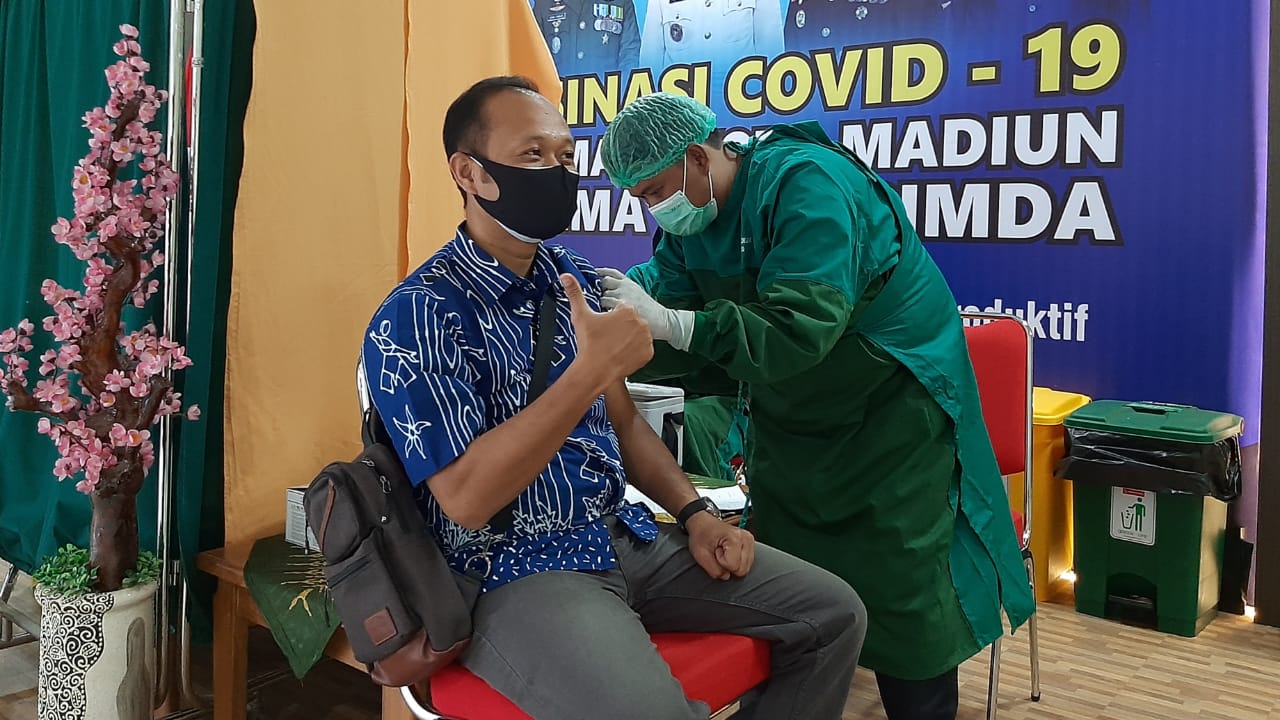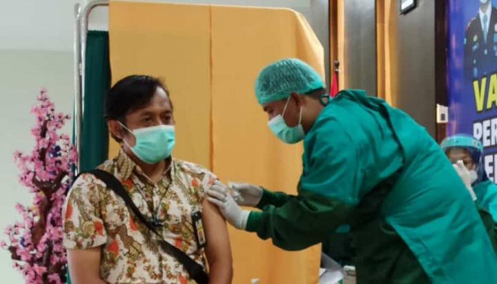 Pegawai Kantor Pelayanan, Penyuluhan dan Konsultasi Perpajakan (KP2KP) Caruban mengikuti vaksinasi Covid-19 dosis pertama di Rumah Sakit Umum Daerah (RSUD) Kota Madiun (Selasa, 9/3). Vaksinasi ini menyasar kepada para pelayan publik, termasuk KP2P Caruban sebagai unit kerja layanan publik.