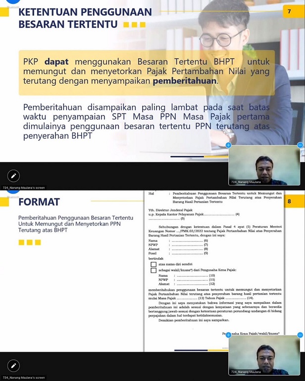 Kelas pajak dimulai pada pukul 14.00 WITA dengan narasumber kelas pajak kali ini adalah Asisten Penyuluh KPP Pratama Bontang Nanang Maulana. Dalam kelas pajak ini, Nanang menjelaskan terkait dengan Peraturan Menteri Keuangan (PMK) Nomor PMK-64/PMK.03/2022 tentang Pajak Pertambahan Nilai atas Penyerahan Barang Hasil Pertanian Tertentu. Nanang menjelaskan PPN atas penyerahan barang hasil pertanian tertentu dapat dipungut dengan mekanisme PPN besaran tertentu sebesar 1,1% final dari harga jual sesuai PMK-64/PMK.03/2022.