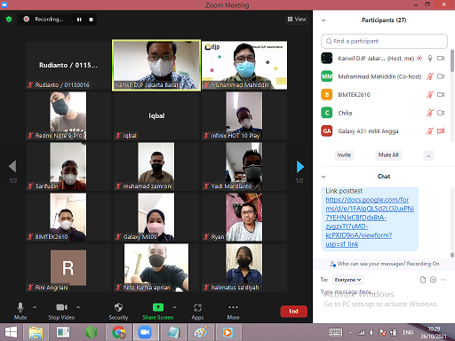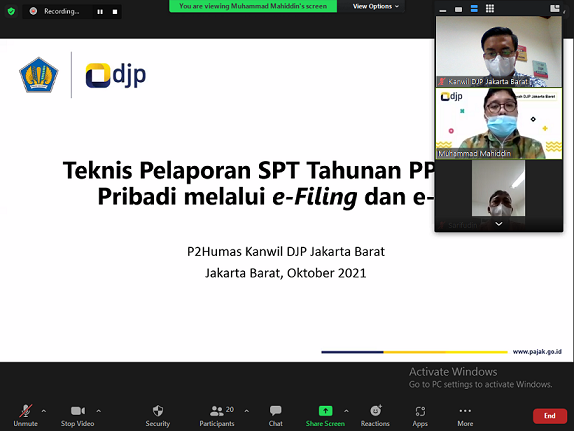 Kantor Wilayah Direktorat Jenderal Pajak Jakarta Barat melaksanakan sosialisasi bimbingan teknis dengan tema “Pelaporan SPT Tahunan Orang Pribadi melalui e-Filing dan e-Form” yang disampaikan oleh Tim Fungsional Penyuluh Kantor Wilayah DJP Jakarta Barat. Kegiatan tersebut dilaksanakan secara daring pada 18 s.d. 26 Oktober 2021 melalui aplikasi Zoom Meeting pada Kantor Wilayah DJP Jakarta Barat (Selasa, 26/10).