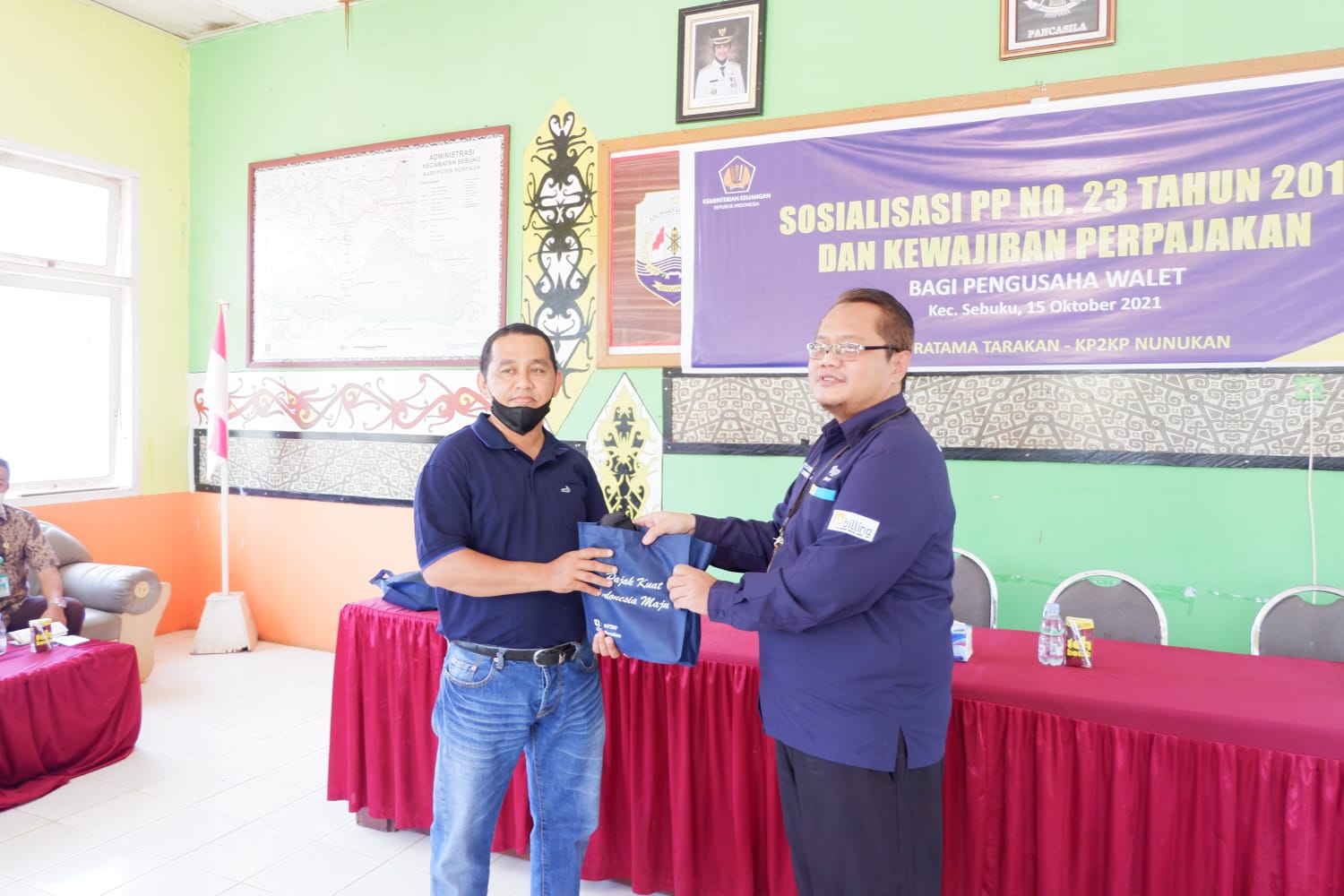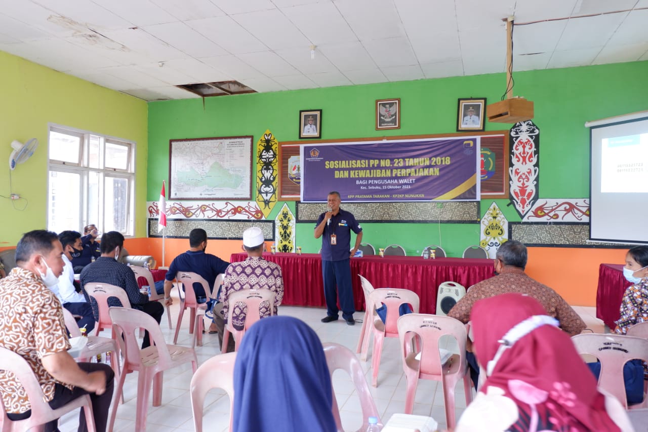 Kantor Pelayanan Penyuluhan dan Konsultasi Perpajakan (KP2KP) Nunukan mengadakan edukasi perpajakan Peraturan Pemerintah Nomor 23 Tahun 2018 yang diikuti para pengusaha sarang burung walet di Aula Kantor Kecamatan Sebuku, Jalan Trans Kaltim, Kabupaten Nunukan (Kamis, 14/10). Kepala KP2KP Nunukan Ari Saptono membuka secara langsung kegiatan edukasi yang dihadiri 17 peserta ini.