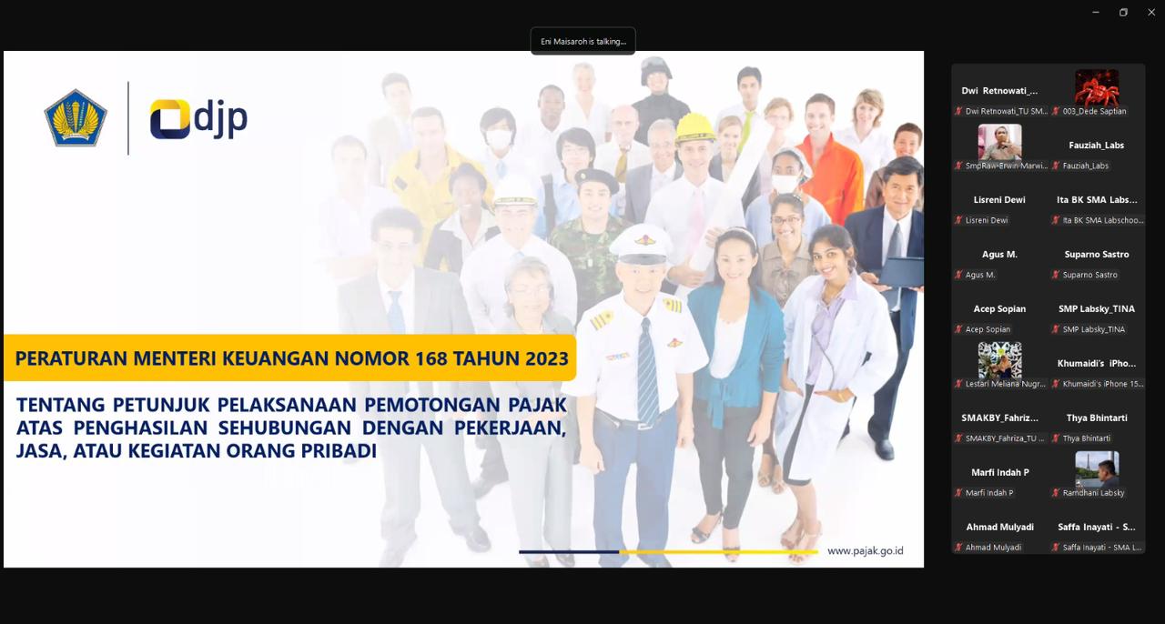 Dalam rangka meningkatkan pemahaman perpajakan di lingkungan pendidikan, Kantor Pelayanan Pajak (KPP) Pratama Jakarta Pulogadung bekerja sama dengan Sekolah Labschool Universitas Negeri Jakarta (UNJ) menyelenggarakan kegiatan Sosialisasi Pajak (Jumat, 4/7). Acara ini diselenggarakan secara daring melalui platform Zoom Meeting dan dihadiri oleh para pegawai dan staf pengajar dari Sekolah Labschool UNJ.