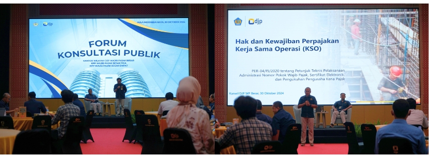 Kantor Wilayah Direktorat Jenderal Pajak (DJP) Wajib Pajak Besar (WPB) baru saja mengadakan Forum Konsultasi Publik yang mengundang Wajib Pajak Besar yang berkaitan dengan Kerja Sama Operasi (KSO). Kegiatan ini bertujuan untuk mendapatkan masukan langsung dari para pelaku usaha terkait kebijakan perpajakan yang sedang berjalan dan rencana ke depan. Acara berlangsung dengan lancar, bertempat di di Aula Indonesia Raya Gedung Dr. K.R.T. Radjiman Wedyodiningrat beralamat di Jl. Jenderal Sudirman Kav.56, Senayan, Kebayoran Baru, Jakarta Selatan (Rabu, 30/10).