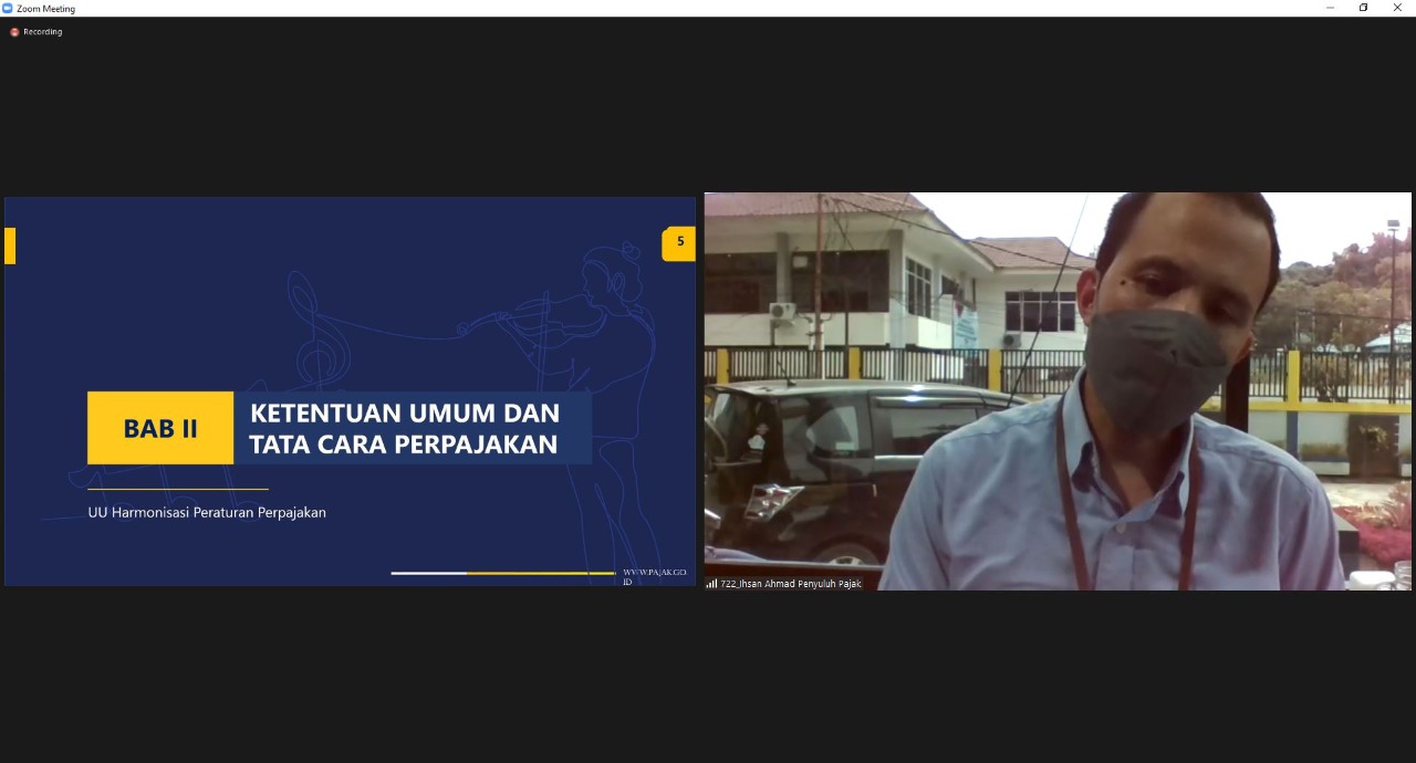 Kantor Pelayanan Pajak (KPP) Pratama Samarinda Ilir menyelenggarakan kelas pajak yang bertemakan Sosialisasi Undang-undang Harmonisasi Peraturan Perpajakan secara daring melalui Aplikasi Zoom Clouds Meeting di Kota Samarinda (Rabu, 29/12).