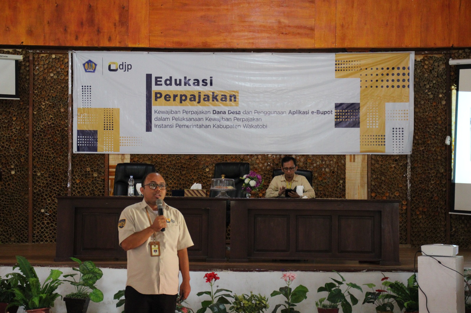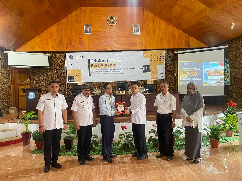 Kantor Pelayanan Pajak (KPP) Pratama Baubau menyelenggarakan edukasi perpajakan tentang Kewajiban Perpajakan Dana Desa dan Penggunaan Aplikasi E-Bupot bagi Bendahara Desa dan Bendahara Satuan Kerja Perangkat Daerah (SKPD) Kabupaten Wakatobi di Gedung Budaya, Mandati II, Kabupaten Wakatobi (Rabu, 21/6).