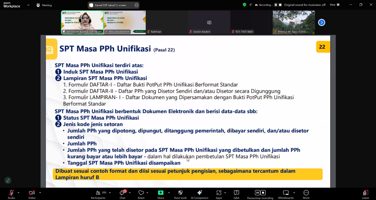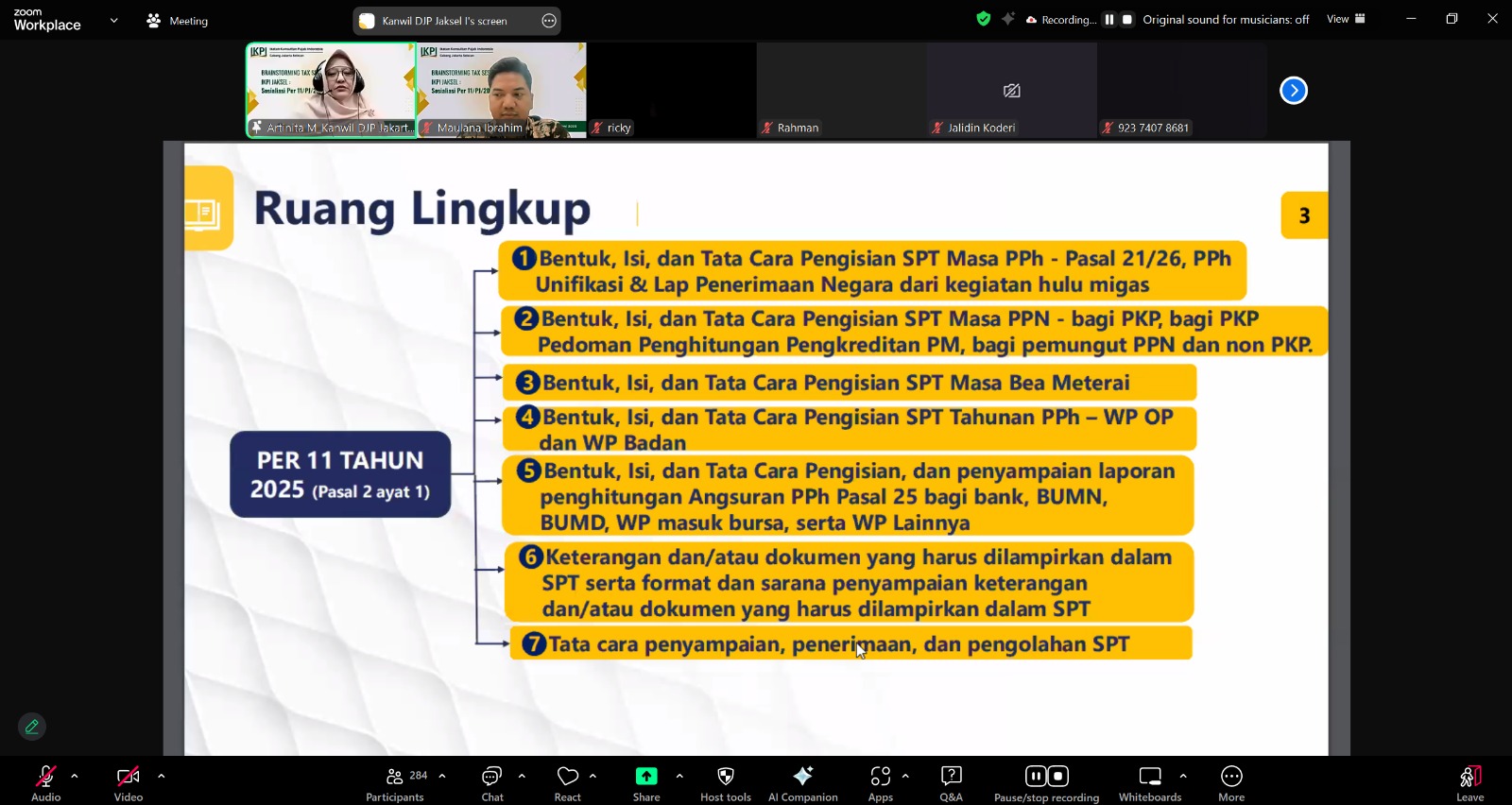 Kegiatan yang bertujuan untuk memberikan pemahaman terkait penerapan PER-11/PJ/2025 ini dipandu oleh dua orang narasumber dari Penyuluh Pajak, yaitu Artinita Monowida dan Ari Widodo. Mengingat luasnya pembahasan, maka pada sesi kali ini narasumber memfokuskan pada ketentuan pelaporan Pajak Penghasilan (PPh) dan Pajak Pertambahan Nilai (PPN).